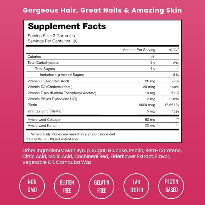 - Tasty Berry Delight: Experience vitamins that are delicious too! Enjoy the vibrant berry flavor while giving your hair, skin, and nails the nourishment they deserve.