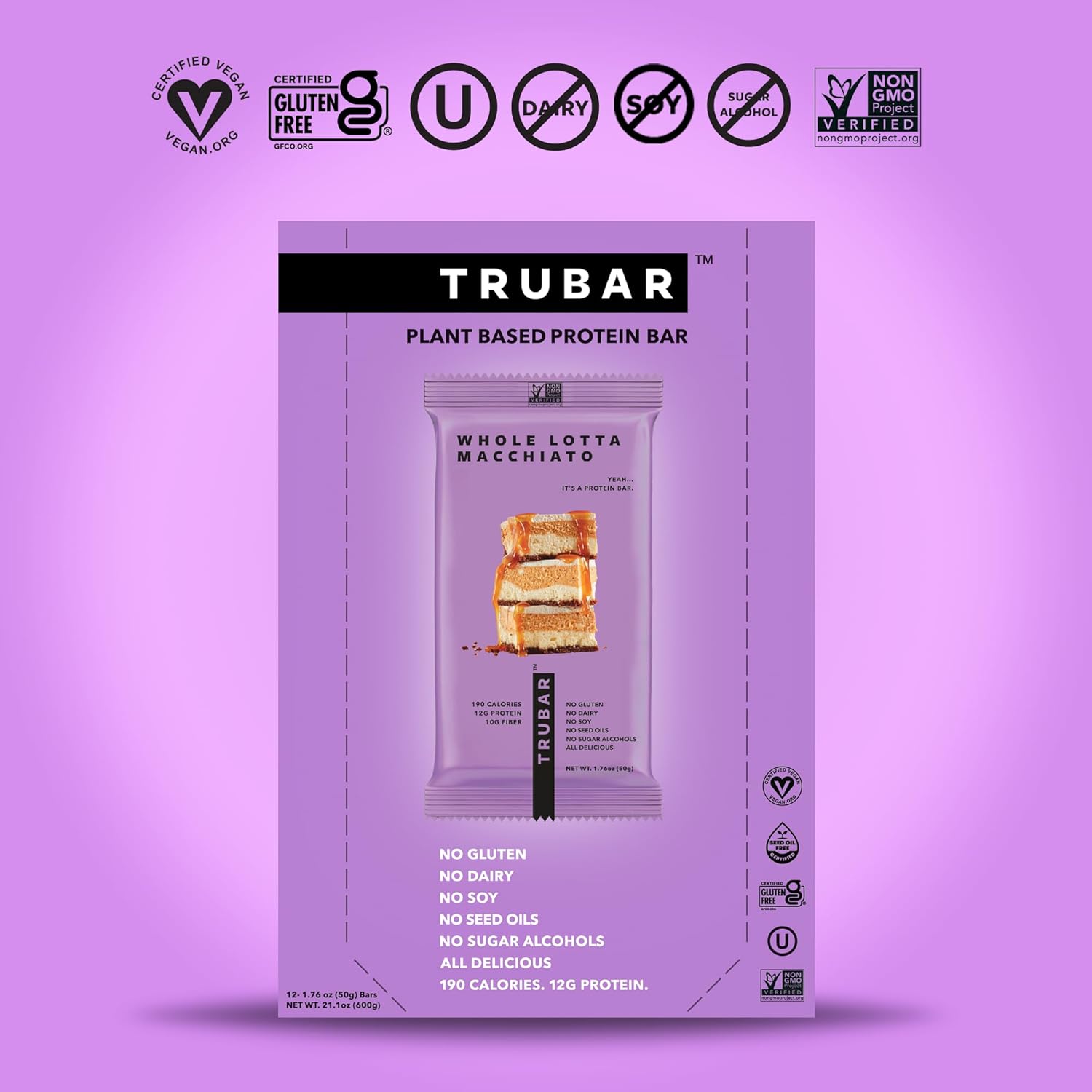 TRUBAR Vegan Protein Bar, Whole Lotta Macchiato, Gluten Free, Plant Based Protein, Dairy Free, Non GMO, Soy Free, No Sugar Alcohols, 12G Protein, 12G Fiber, 23G Carb, On the Go Snack Bars, 12 CT