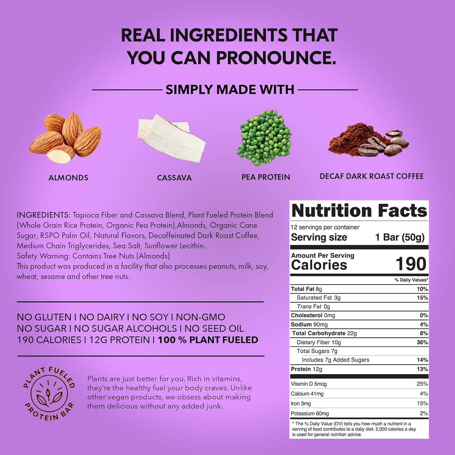 - ENJOY GUILT-FREE INDULGENCE: Fuel your day with the satisfying taste of Whole Lotta Macchiato Protein Bars—made with real ingredients like Almonds, Cassava, and Pea Protein. Each 190-calorie bar packs in 12g of plant-powered protein and 12g of fiber, offering a rich macchiato-inspired treat that supports your energy and keeps cravings at bay. Snack boldly, snack smart.