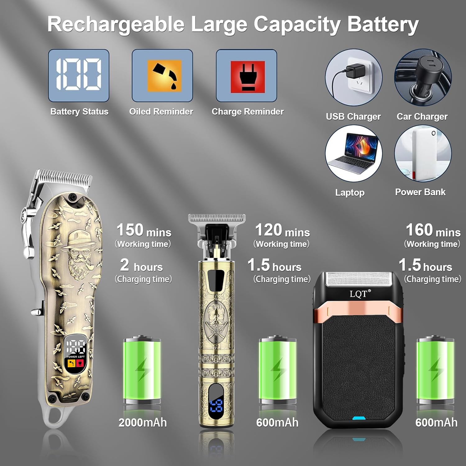 - 【POWERFUL MOTOR & LARGR CAPACITY BATTERY】The LQT clippers for hair cutting contains a high capacity battery that allows for 180 minutes of use after 3 hours of charging. The beard trimmer can be used for 160 minutes after 1.5 hours of charging,you can use USB charging port to connect USB adapter, laptop, car charger.