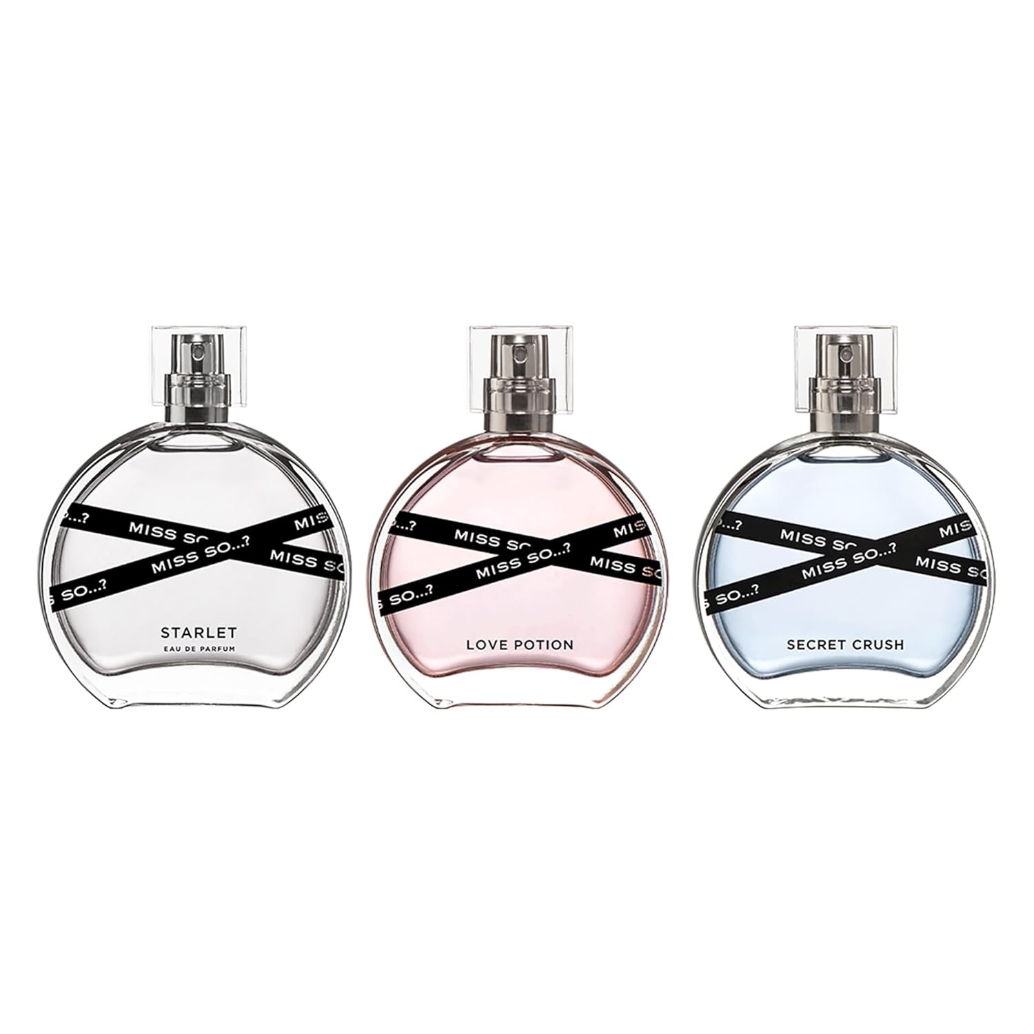 - 3 Distinct Scents: The Miss So perfume set includes three unique fragrances. Secret Crush with floral notes and a musk base, Starlet with fruity notes and a creamy base and Love Potion with fruity notes and a floral base.