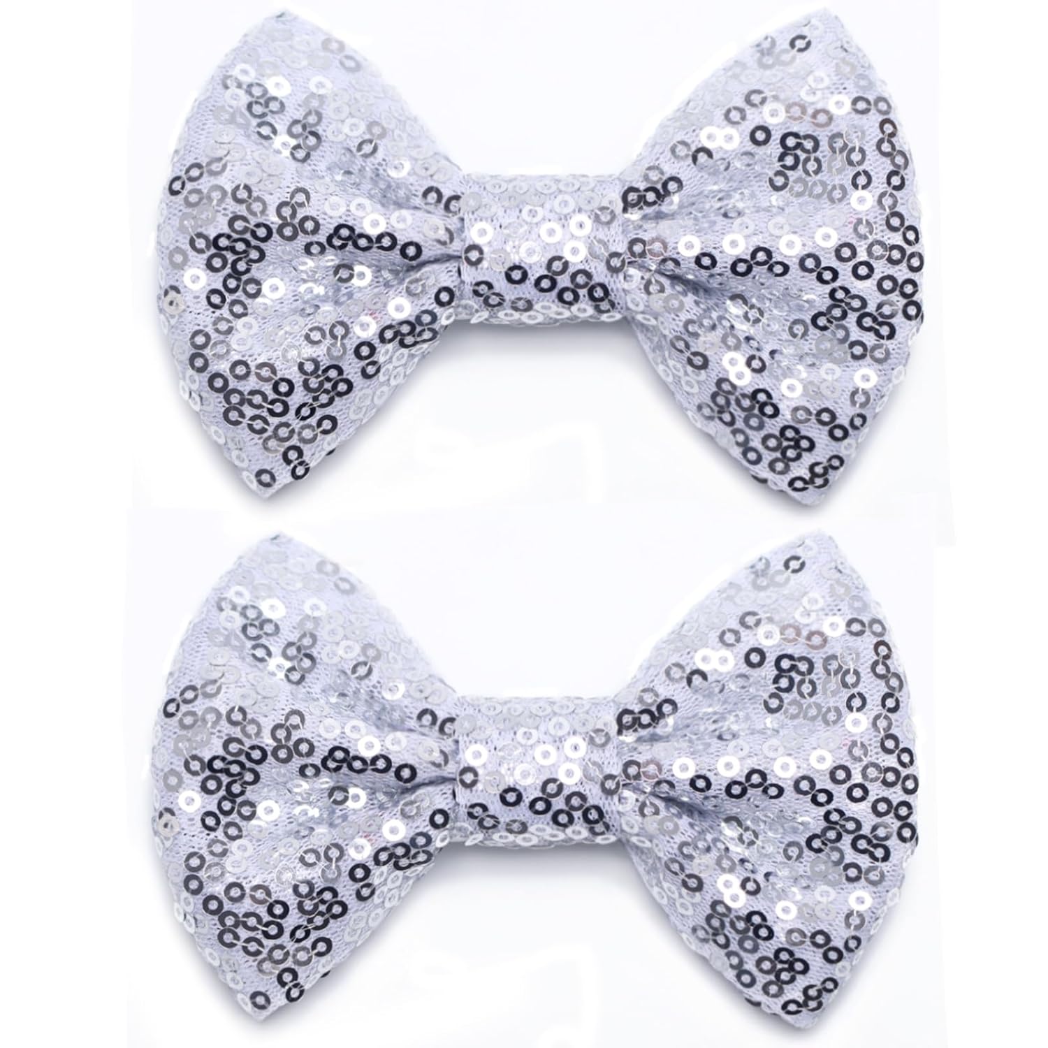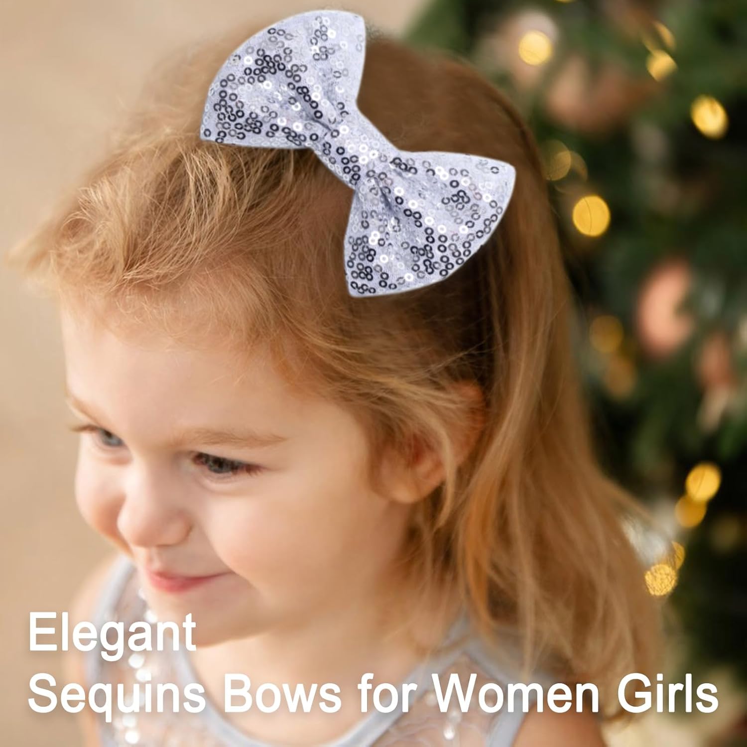 KISZU 4 Inch Sequin Glitter Hair Bows Clips, Sparkling Bling Little Bow HairPins Hair Accessories for Baby Girls Kids Children Teens and Women (Sliver)