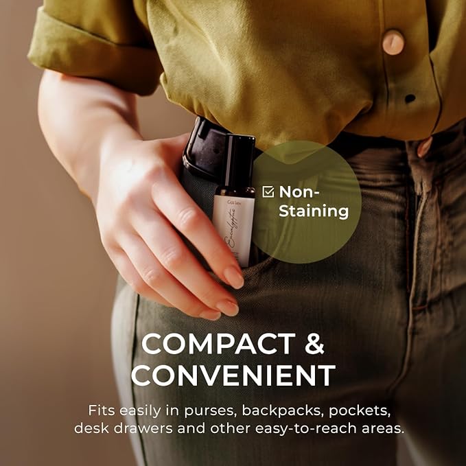 • Portable wellness on-the-go: Enjoy the convenience of portability with our eucalyptus roller ball, allowing you to apply it anywhere and anytime as needed. Whether at home, work, or on travel, our roll-on ensures relaxation at your fingertips.