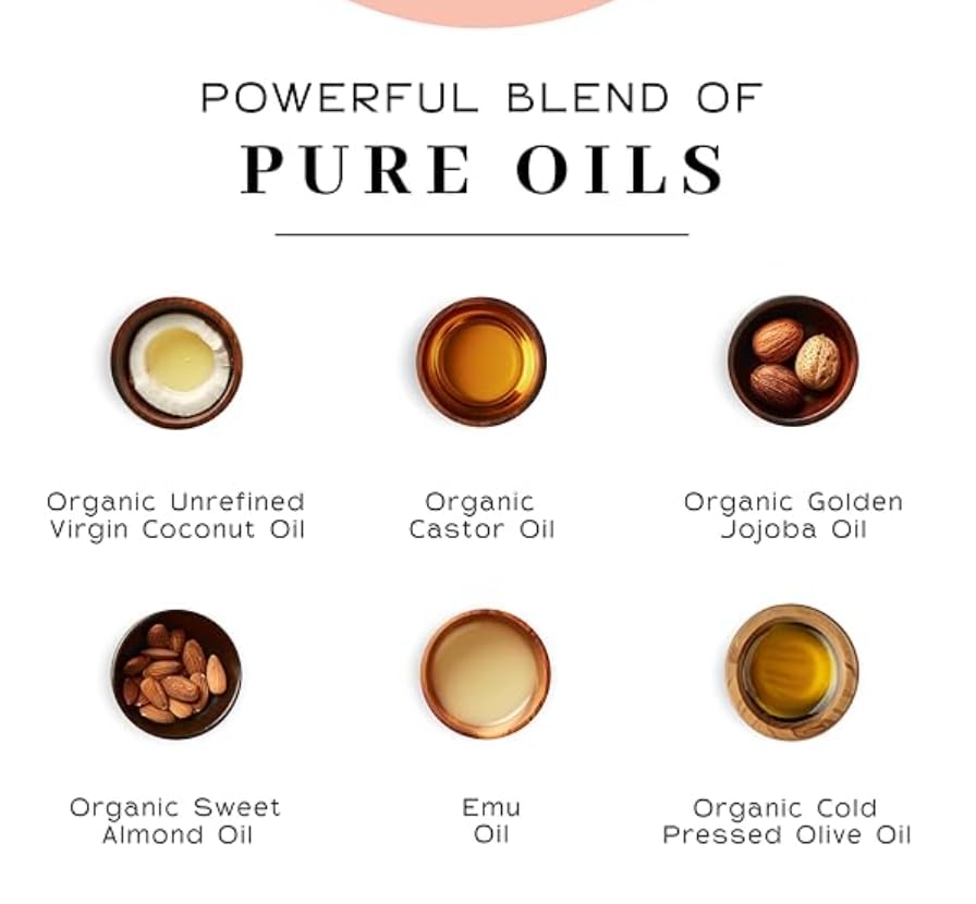 - Powerful Blend of Pure Oils - This hair serum is a potent mix of castor oil and coconut oil for hair, including almond, olive, emu, and jojoba oil; it's an idea oil for hair growth and damaged hair that needs a boost of hydration and strength