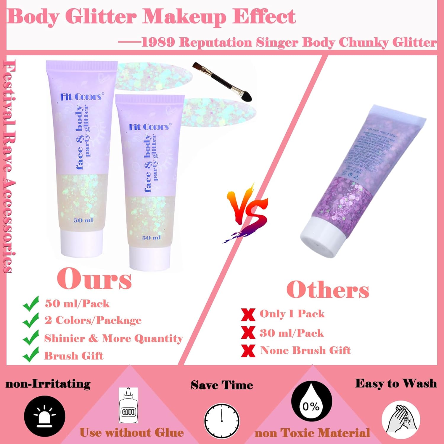 - Easy to Use and Remove: 1989 reputation singer face body Chunky Glitter is a glitter body gel that is sticky,Body glitter gel no need to use glue when using it, you can apply glitter gel to hair and body with fingertips or brush we match, save your makeup time.It can be used directly on the skin wherever you want to decorate,it will be dry for a moment, and will last all day. You can wash the body glitter easily through the water and soap.