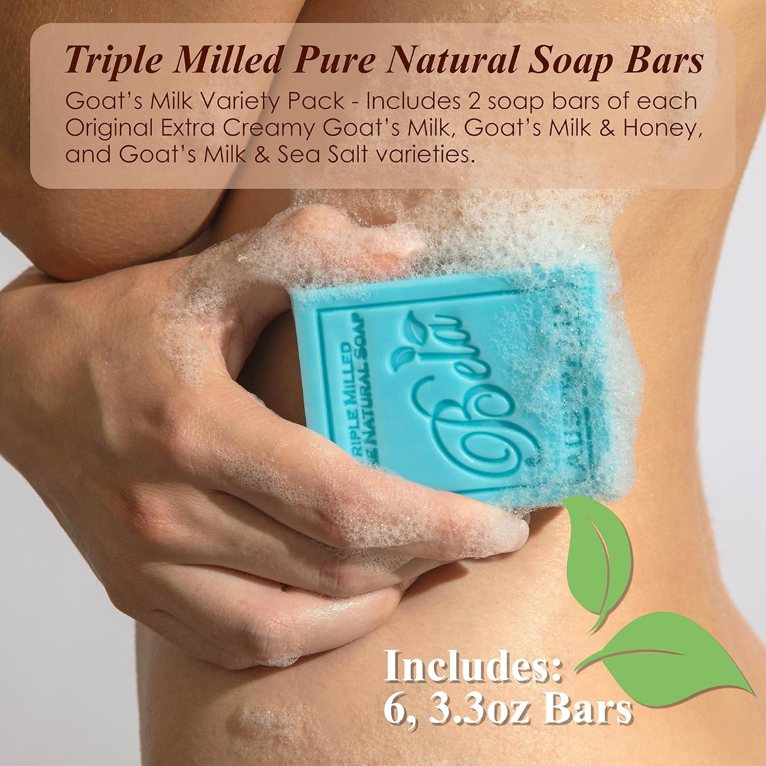 BELA Soap Bar Variety Pack, Pure Goats Milk, Honey, and Sea Salt, Long Lasting, Triple Milled Face Hand and Body Soap Enriched with Organic Shea Butter