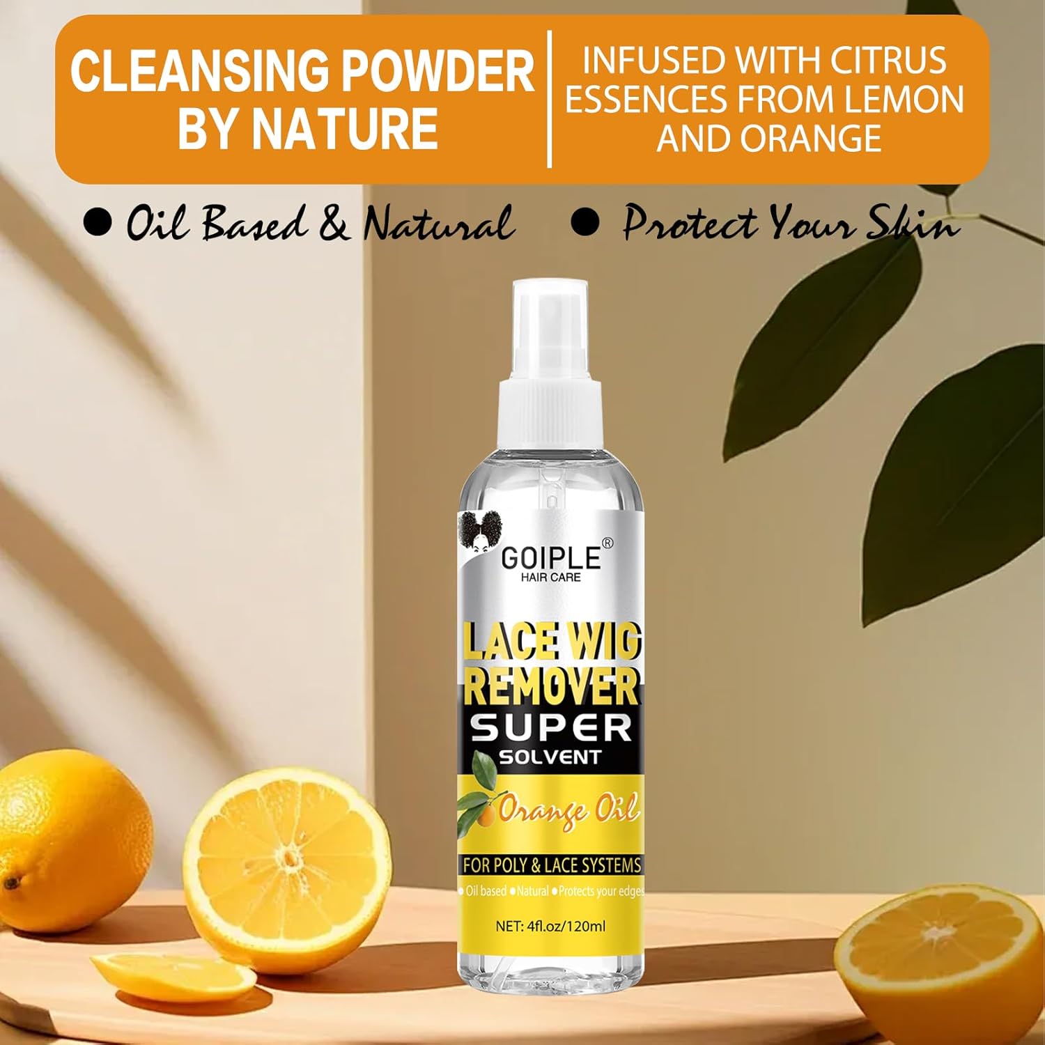- MILD FORMULA: Our amazing lace removal spray formula is mild and it is infuse citrus extracts, coming from orangeand lemon, no harmful chemicals added, no harm to the skin, you can use the spray adhesive remover to easily remove the wig