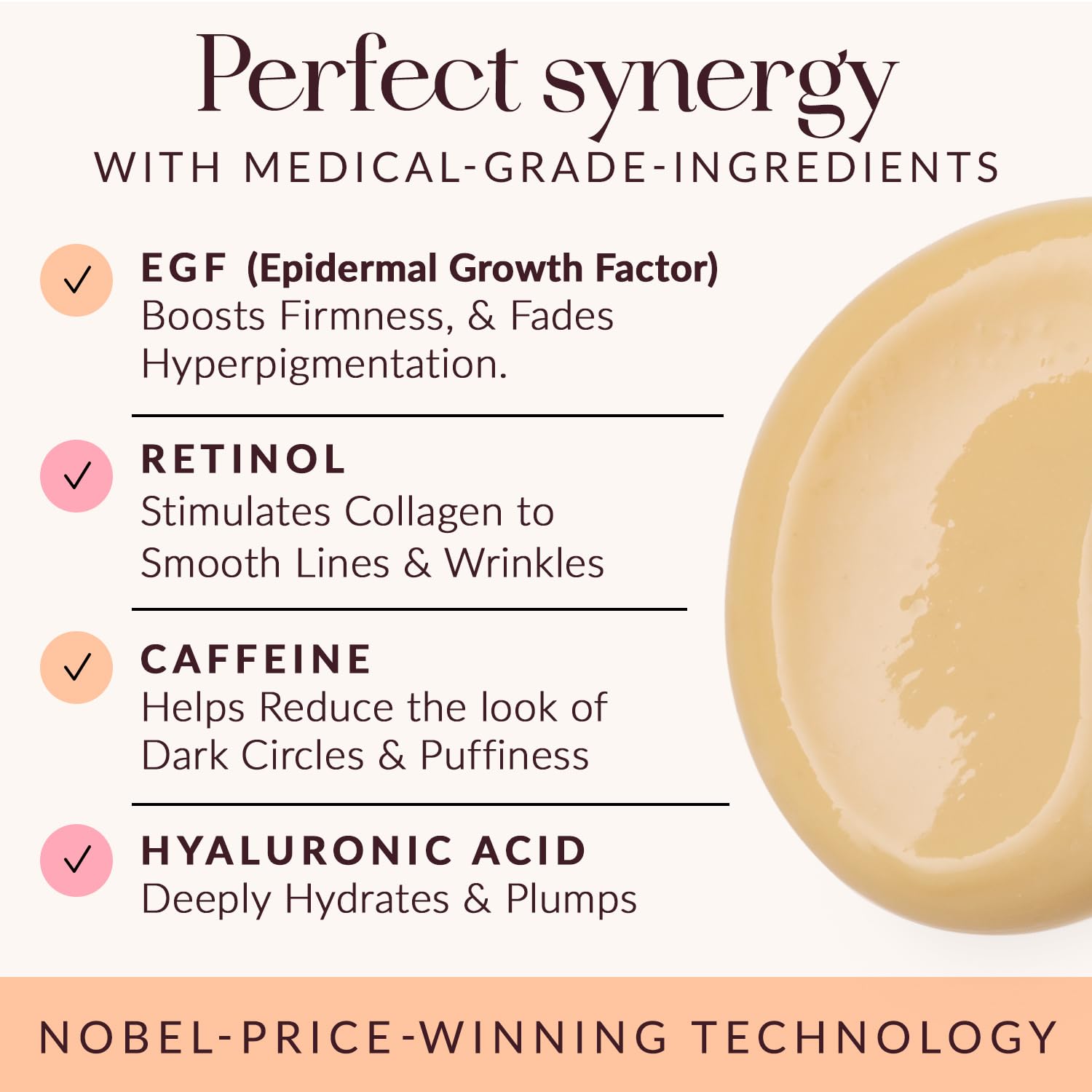 - Nobel-Prize-Winning Technology: Experience transformational results delivered by pairing EGF, Retinol, Hyaluronic Acid, and Caffeine in one medical-grade formulation with the purest ingredients. This retinol eye cream acts as a gentle & powerful synergy to boost collagen production, accelerate skin regeneration, and deeply hydrate & revive the eye area. It also works as an eye cream for puffiness and bags under eyes and an eye depuffer to achieve unparalleled rejuvenation and visibly youthful, radiant eyes.