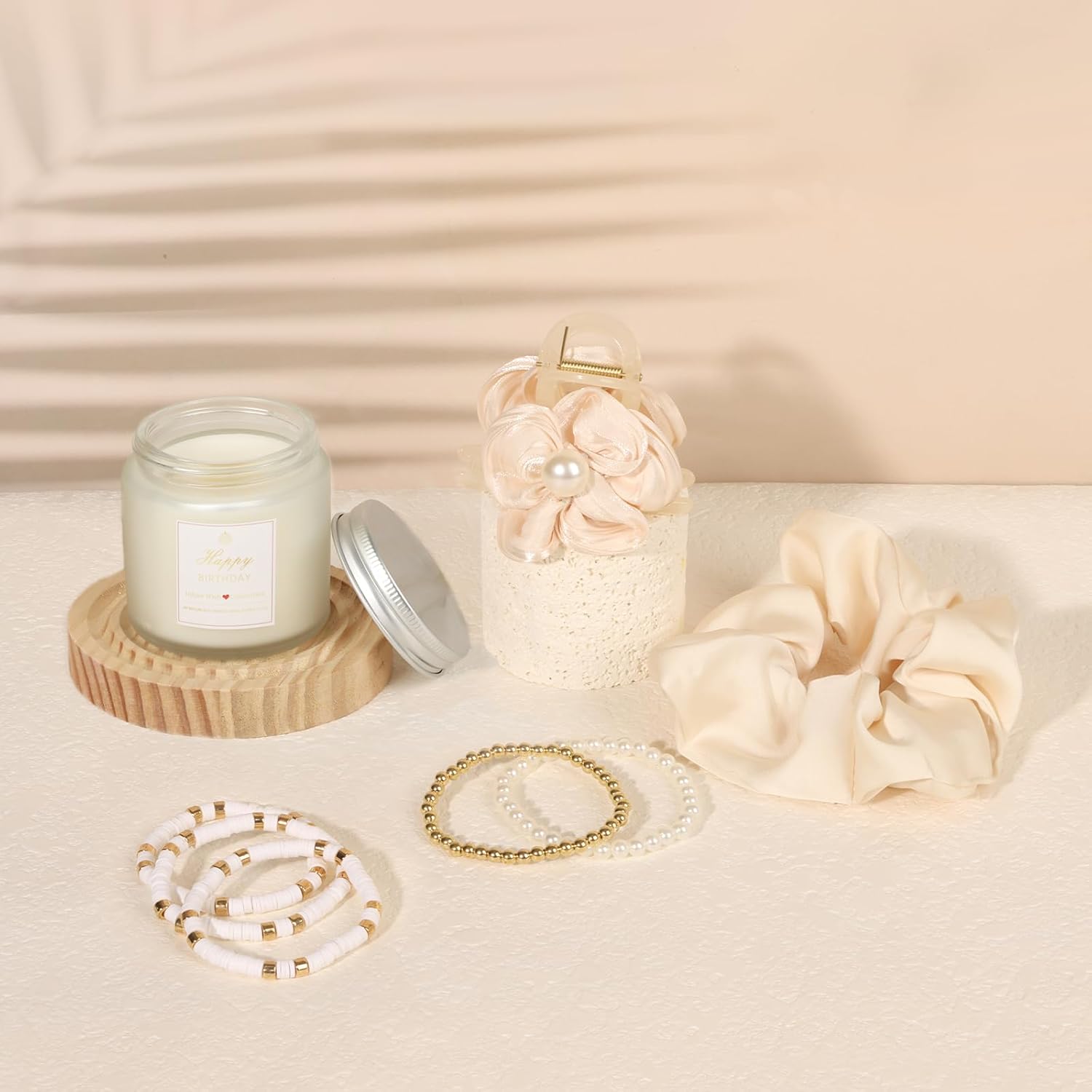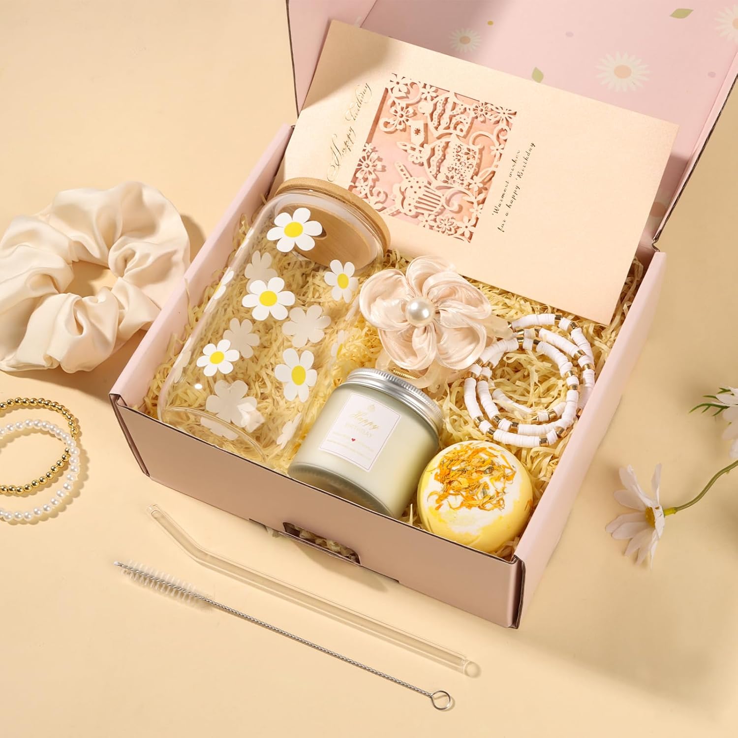 - 🎁 [What's In The Box]: This thoughtfully curated gift set includes 1* 16oz Daisy flowers coffee glass cup with a bamboo lid, straws and cleaning brush, 1* soy scented candle, 1* bath bomb, 1* flower hair clip, 1* silk hair scrunchie, 1* set of clay beaded bracelets, 1* paper cut happy birthday card, and a Unique Ideas cute box package.