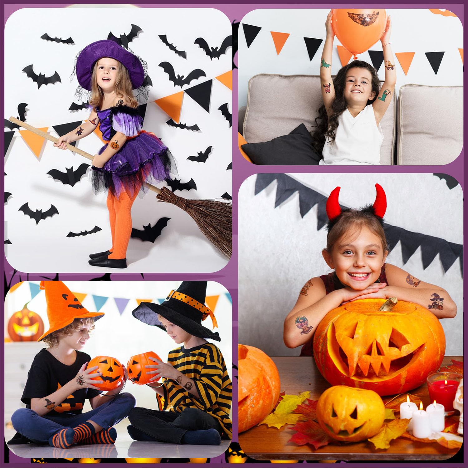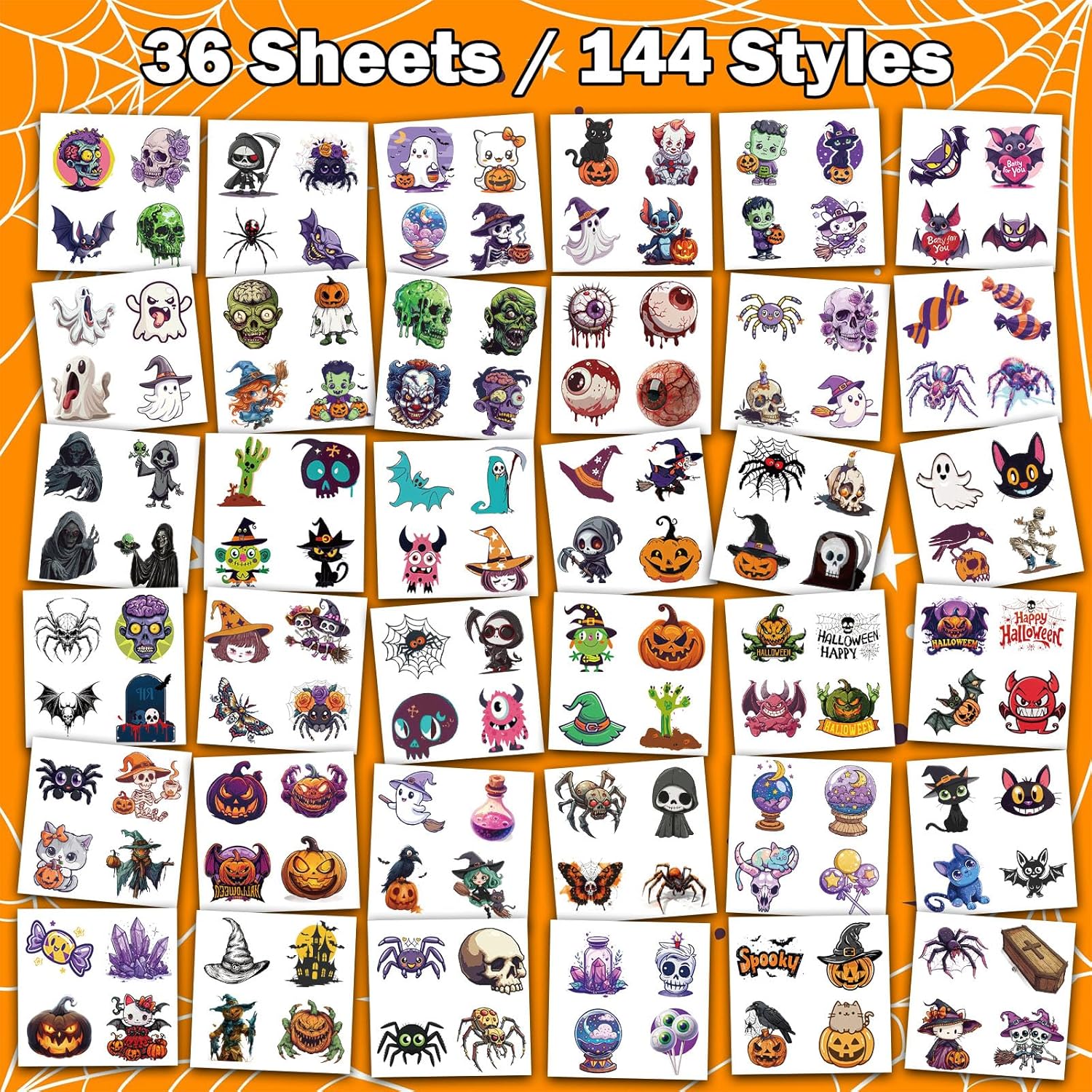 - [Classic Halloween Tattoos]: 144 different styles of Halloween kids tattoos, creepy but cute, perfect for boys and girls of all ages. Includes Halloween pumpkins, witches, skeletons, vampires, bats, ghosts etc. Realistic Halloween decorations temporary tattoos can be stick on arms, shoulders, face, wrists, hands, feet, legs, neck, etc.