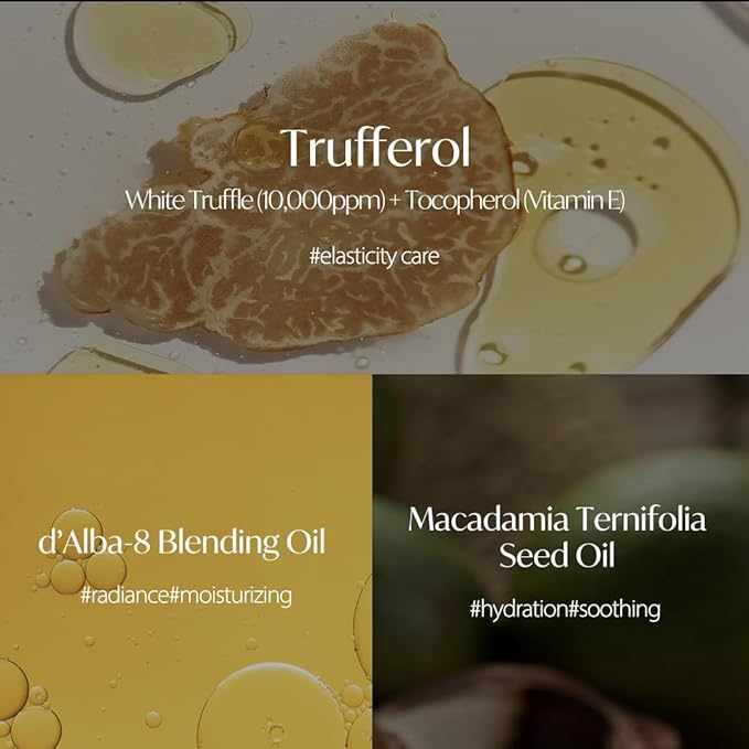 - TRUFFEROL — d'Alba's unique blend of Italian white truffle and vitamin E, offering antioxidant protection, deep hydration, and a radiant glow.