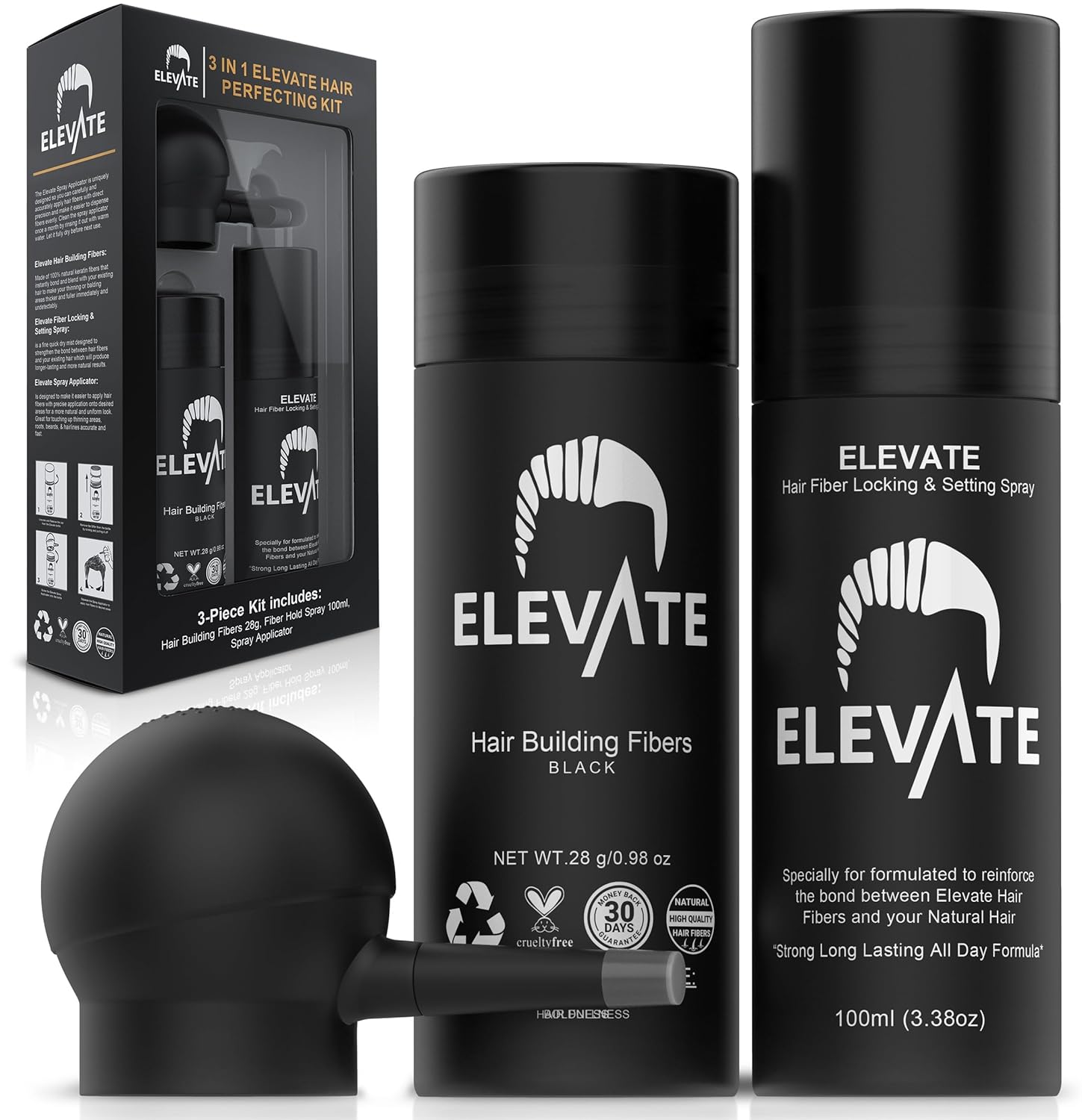 - BLACK COMBO 3-IN-1 VALUE KIT - INSTANT THICKER FULLER HAIR IN SECONDS: Elevate Hair Building Fibers gives you the immediate appearance of thicker, fuller hair. The Spray Applicator Pump allows precise application of hair fibers to make the process easier and faster for thinning or balding areas. The Hair Fiber Locking Spray is a long-lasting all-day formula to keep fibers in place and look more natural.