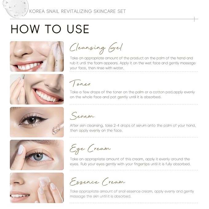 - [KOREAN SNAIL SKINCARE SET 5-PACK] - Korean snail skin care kit has all your favorite moisturizing necessities: including 50g cleanser, 100ml toner, 17ml face serum, 25g face cream and 15g eye cream and leaving your skin soft and vibrant since the first skincare.