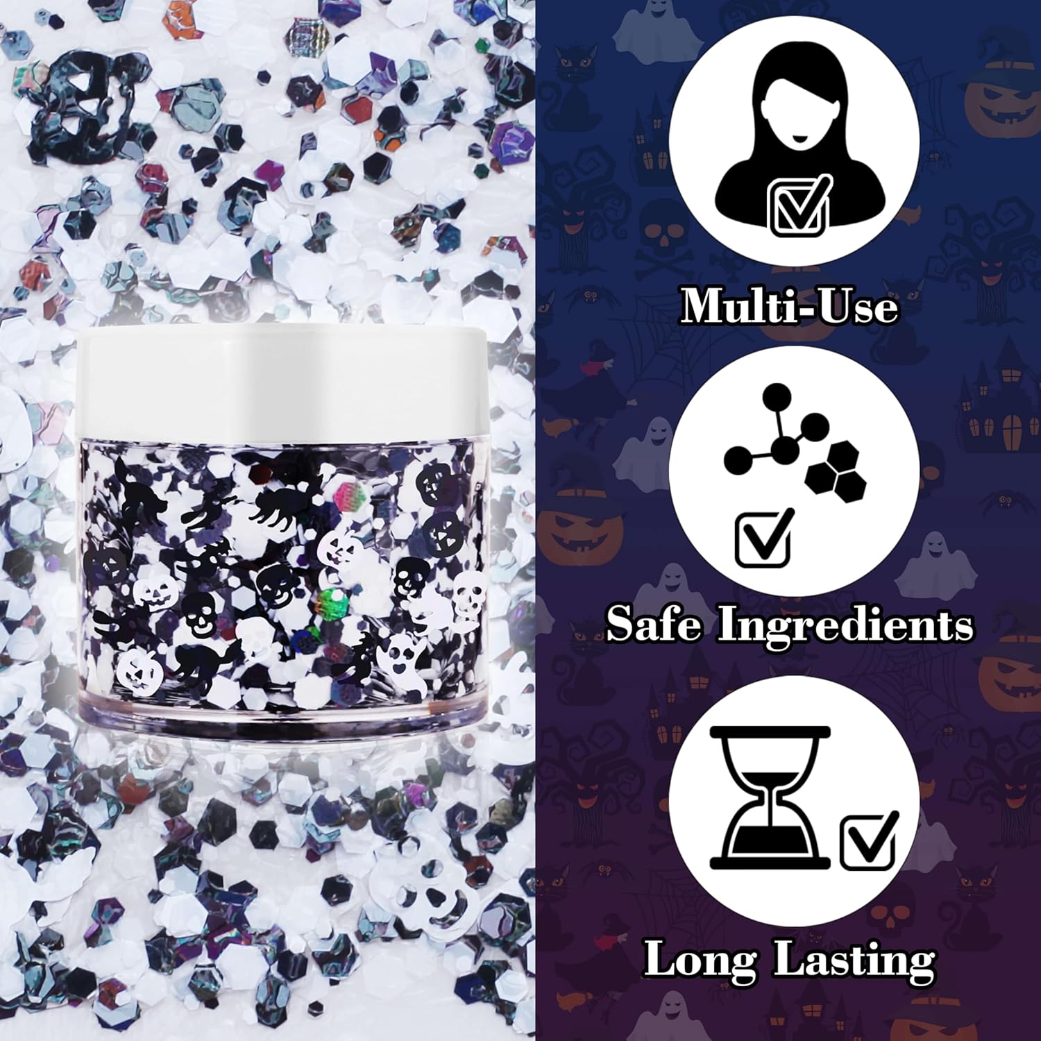 Halloween Body Glitter Gel,Black White Skull Pumpkin Professional Vibrant Music Festival Party Rave Accessories,Sparking Chunky Face Glitter Paint Makeup for Women and Kids