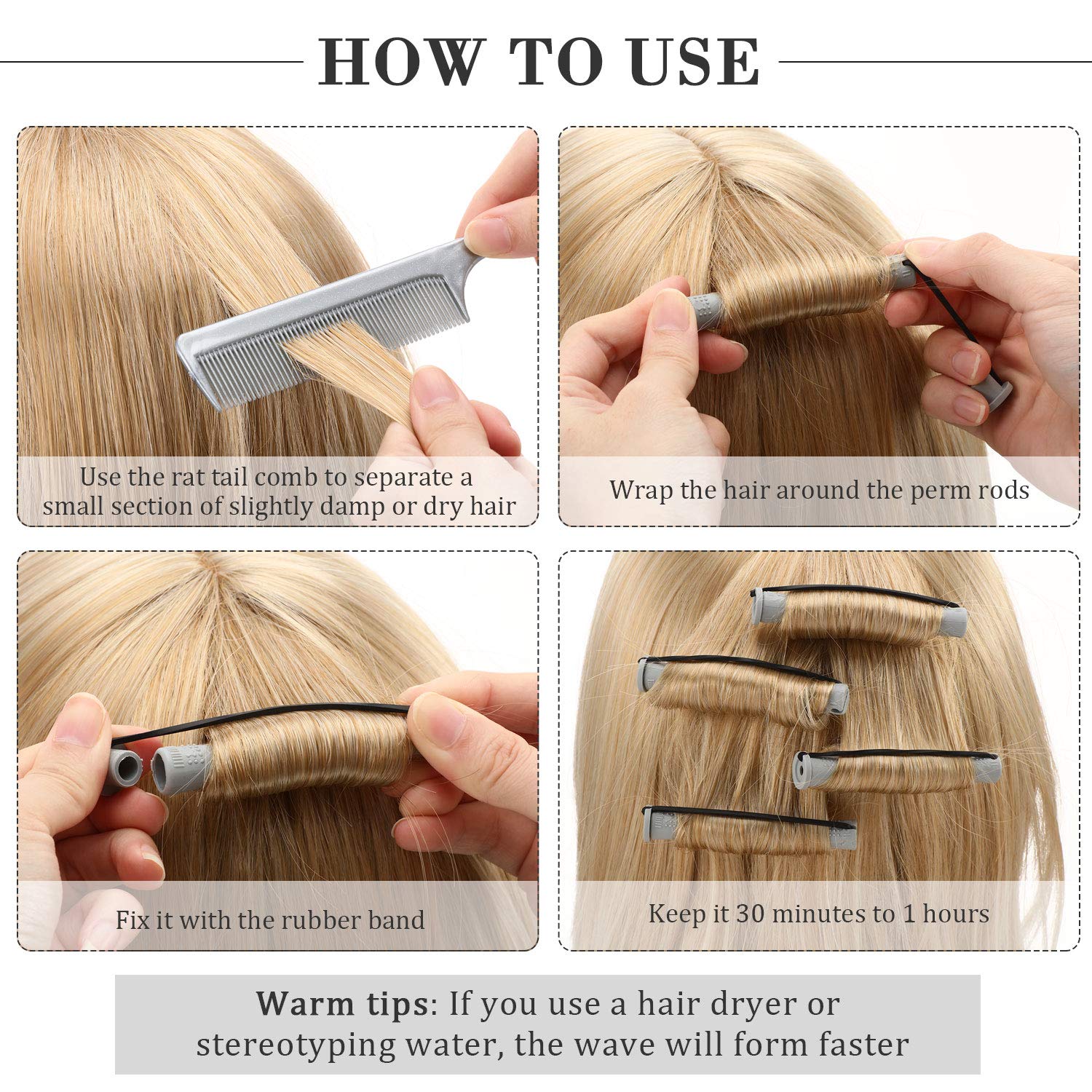 - Simple operate steps: just use the rat tail comb to separate a small handful of slightly damp or dry hair, and wrap it on the rods; Then use the rubber band to fix it, does not require heating, no harm to the hair; Just wait for a while, you can make a natural curling hairstyle, adjust the direction of starting roll hair in or out can create various hair wave
