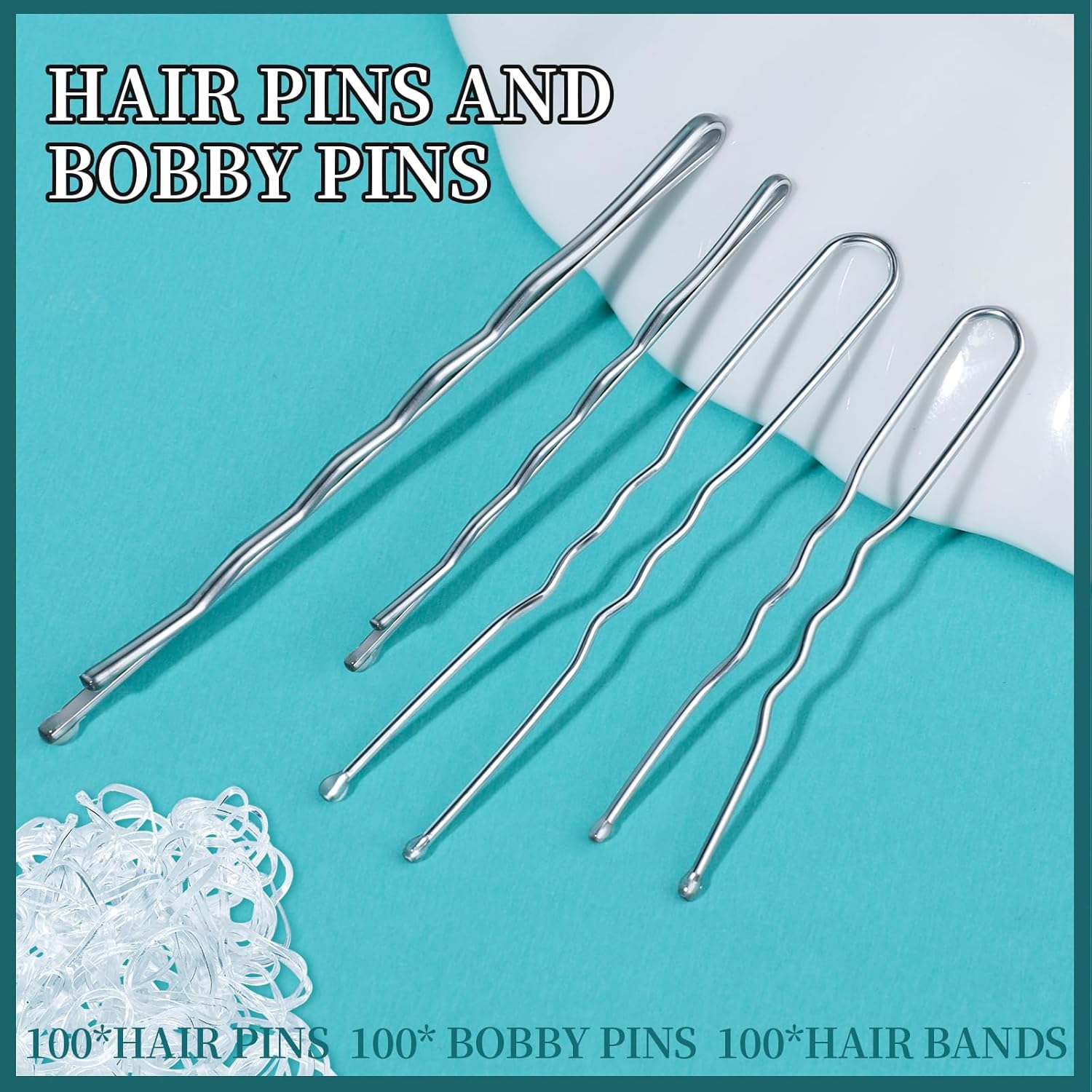 Teenitor 300pcs Silver Bobby Pins Hair Pins Kit, 100pcs Bobby Pins 100 Hair Pins for Women for Buns, 100pcs Hair Bands, 2" 2.36", Silver Bobb y Pins for Gray Hair 2" 2.75"