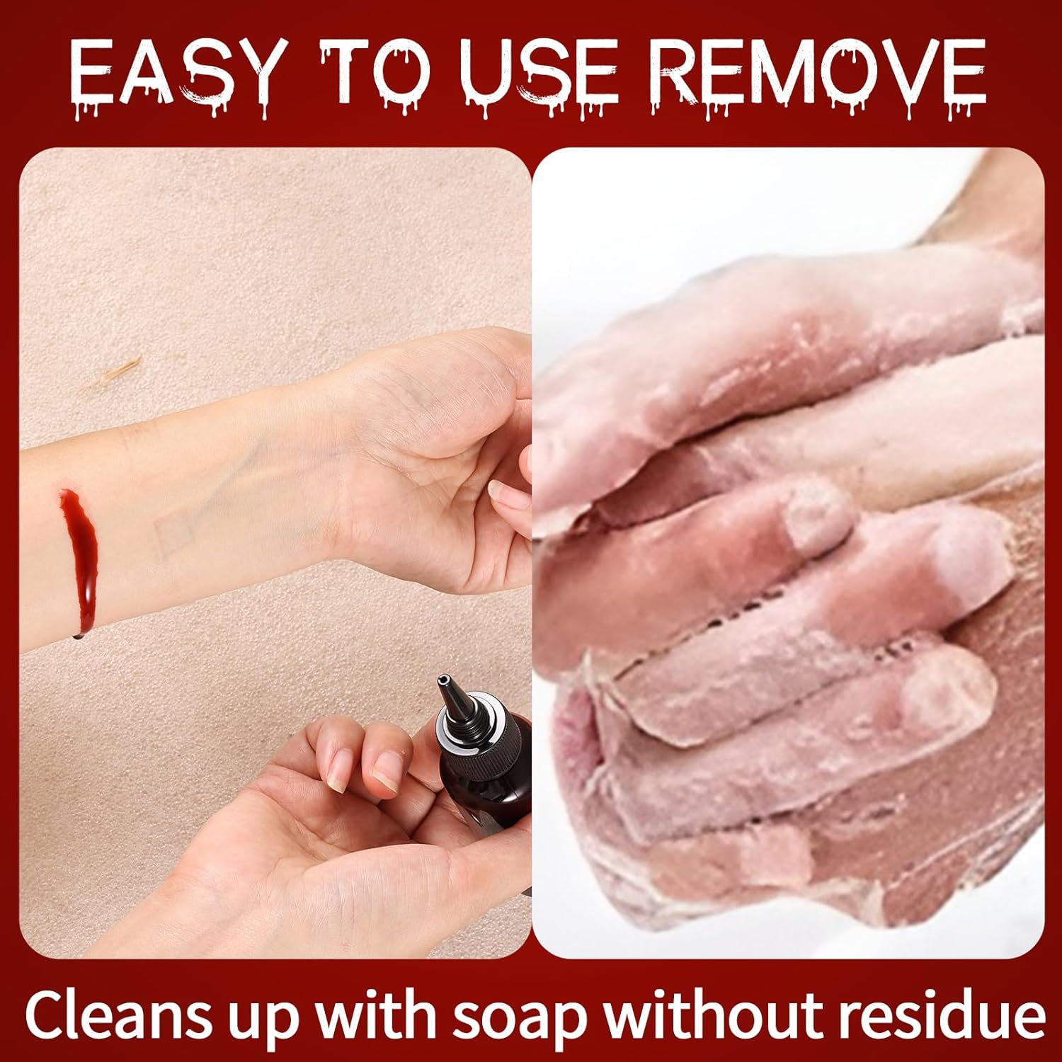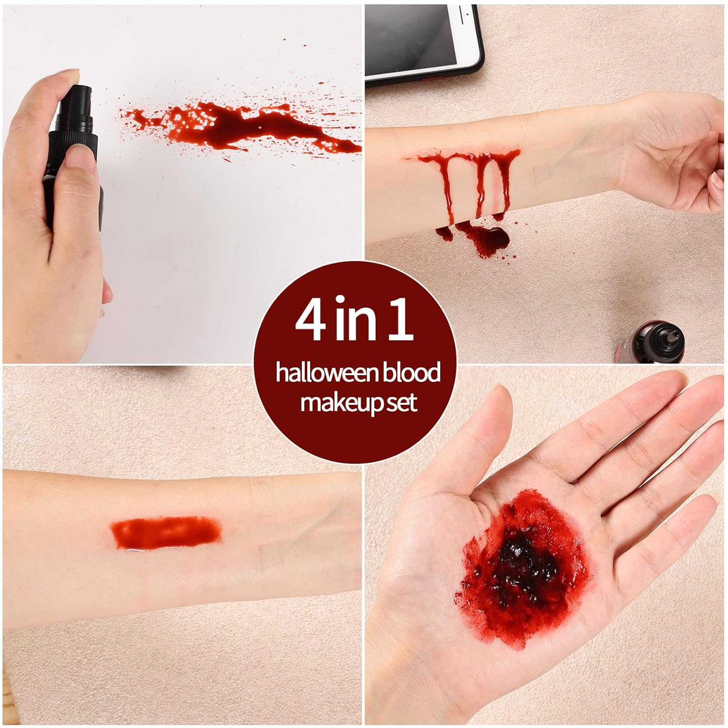 - Halloween Realistic Fake Blood: 3 products you will get! Blood Box with a viscous syrup like texture texture, doesn't flow or dry, and Halloween Fake Blood Spray Spray to body for face, arms and legs or the clothes makeup