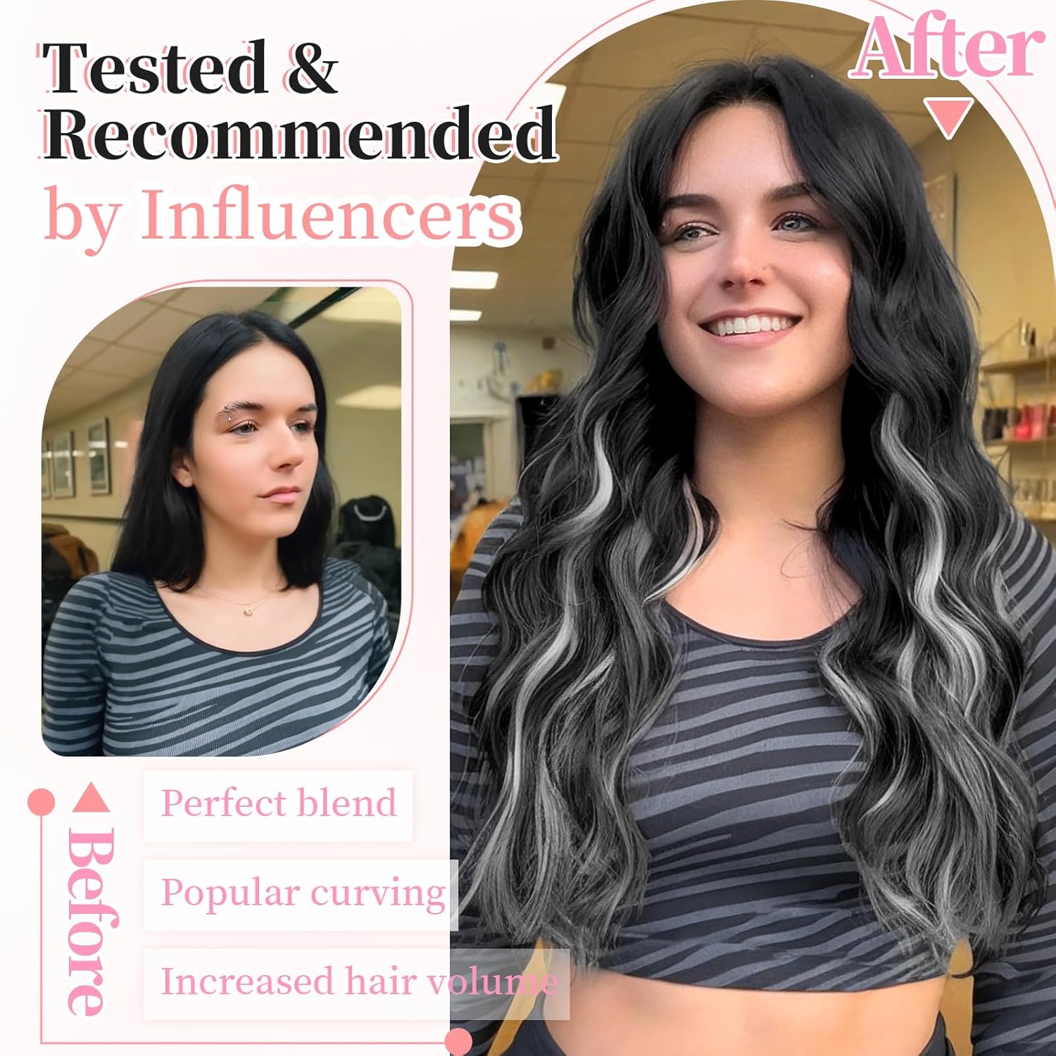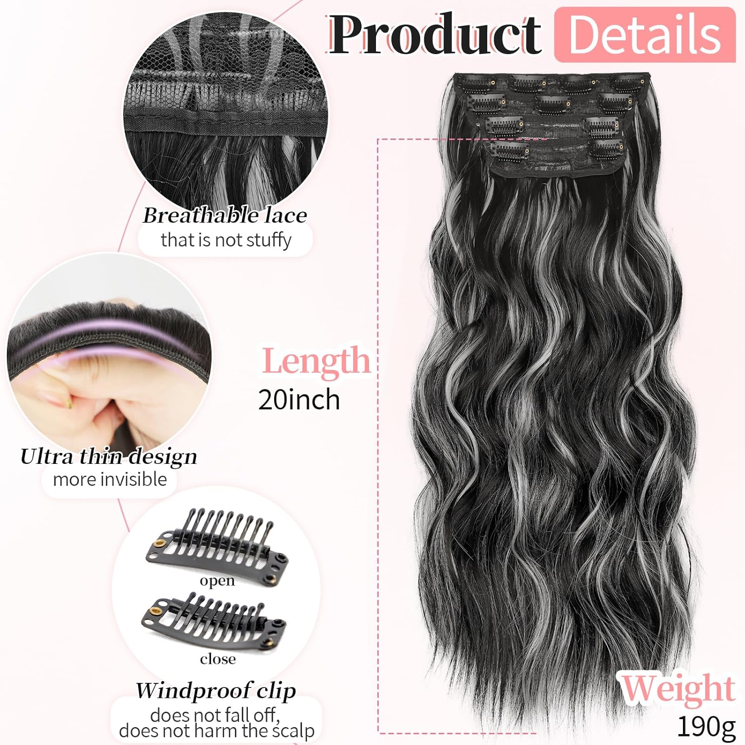 KooKaStyle Clip in Hair Extensions Long Wavy 4PCS Thick Hairpieces Synthetic Highlight Hair Extensions Black and White Mix Fiber Double Weft Natural 20Inch for Women