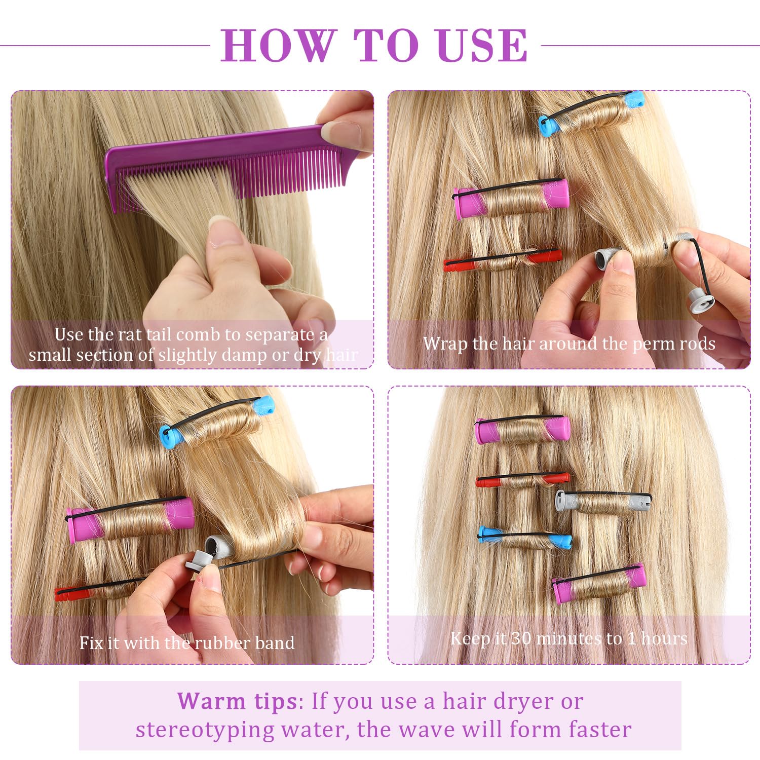 - Easy and convenient to operate: you can use the pintail comb to part your slightly damp or dry hair, then take a pinch of hair and wrap it on the rod, fix with rubber band and wait for some time, finally you will get natural and charming curly hair