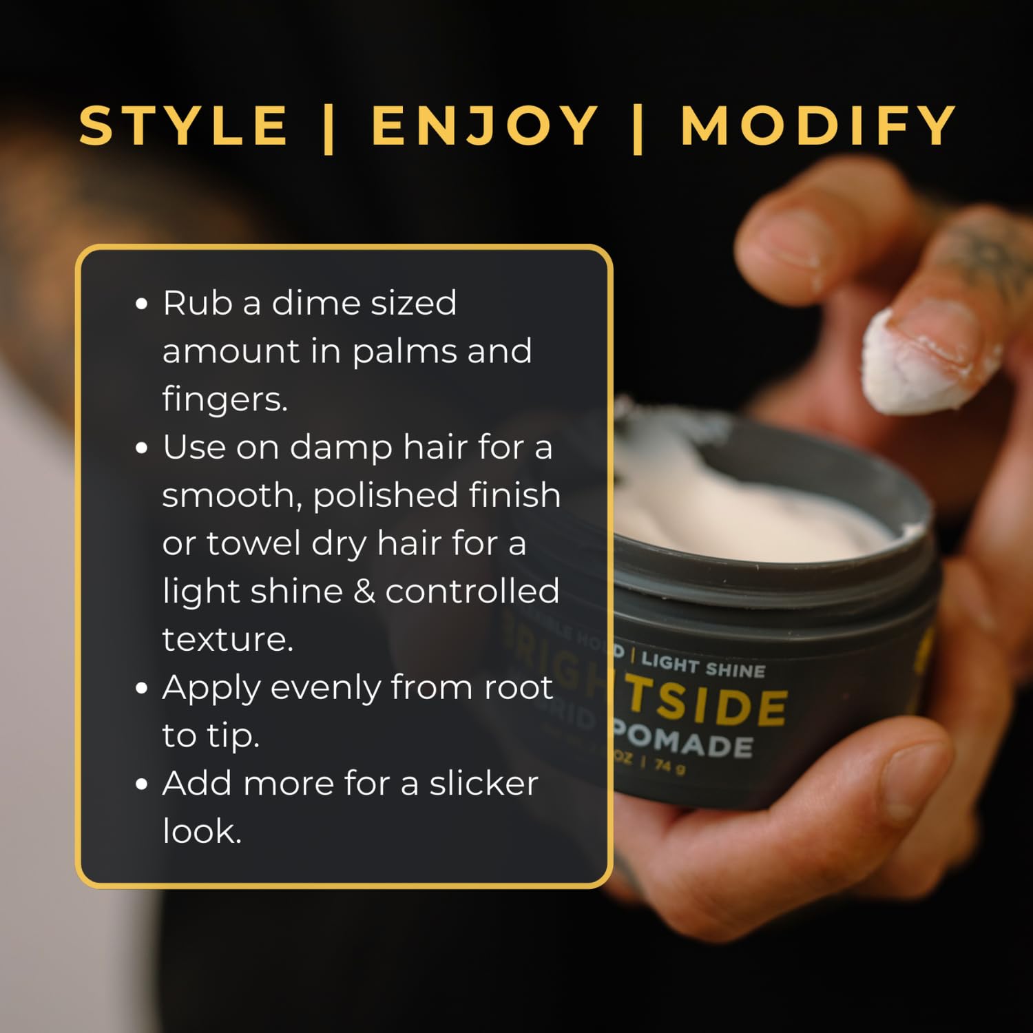 - MODERN POMADE WITH A CLASSIC TWIST: BRIGHTSIDE Hybrid Pomade delivers a flexible hold with a light, natural shine, giving you the polished, classic styles you love without the greasy feel. Perfect for slicked-back looks, undercuts, or adding control of flyaways with wavy and longer hair.