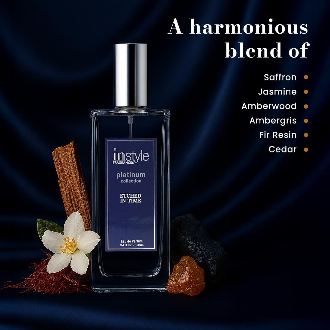- PLATINUM COLLECTION: Etched in Time is a sophisticated fragrance where twists of cedarwood meet saffron in a balancing act with jasmine that imbues the body with crystalline radiance.