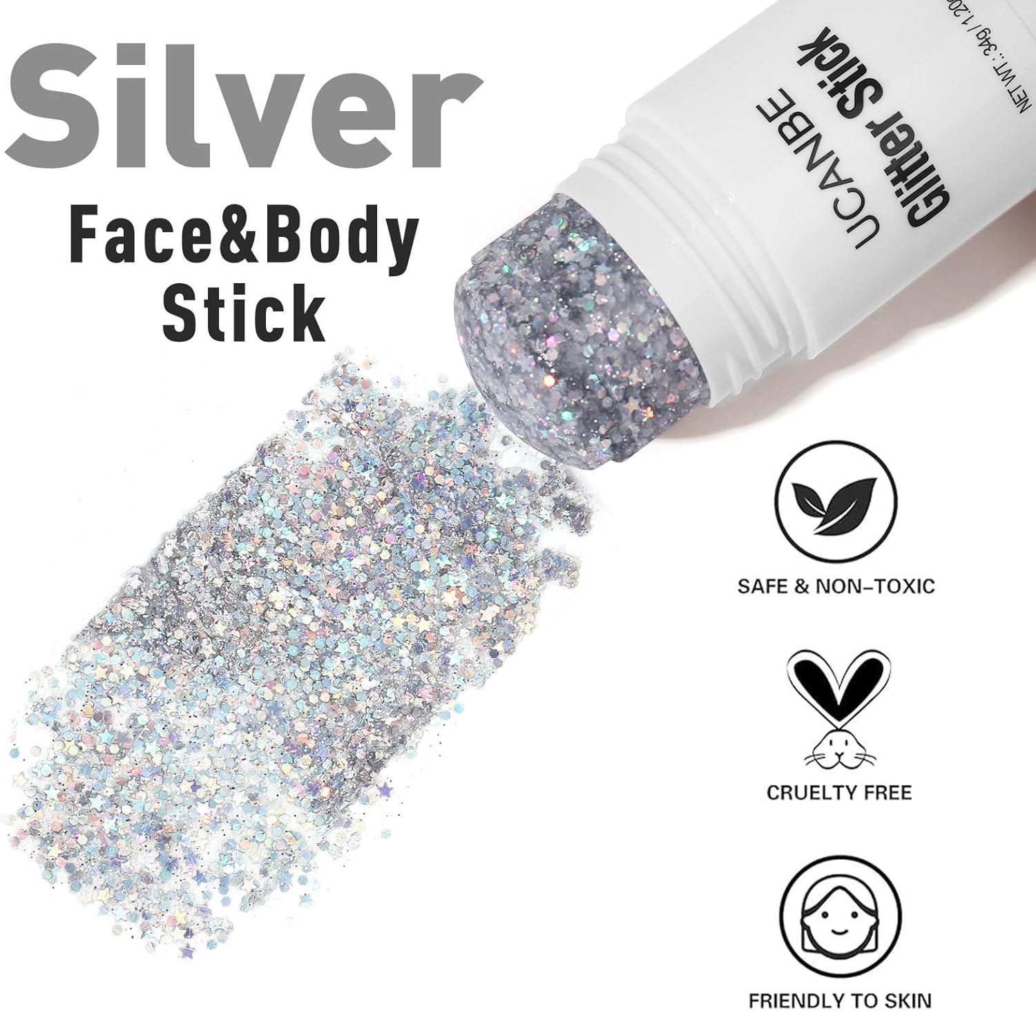 UCANBE Silver Body Glitter Stick for Singer Concerts Music Festivals, Face Glitter Makeup for Face Body Hair Eyes & Lips, Chunky Glitter Sparkling Mermaid Sequins for Women 1.2OZ