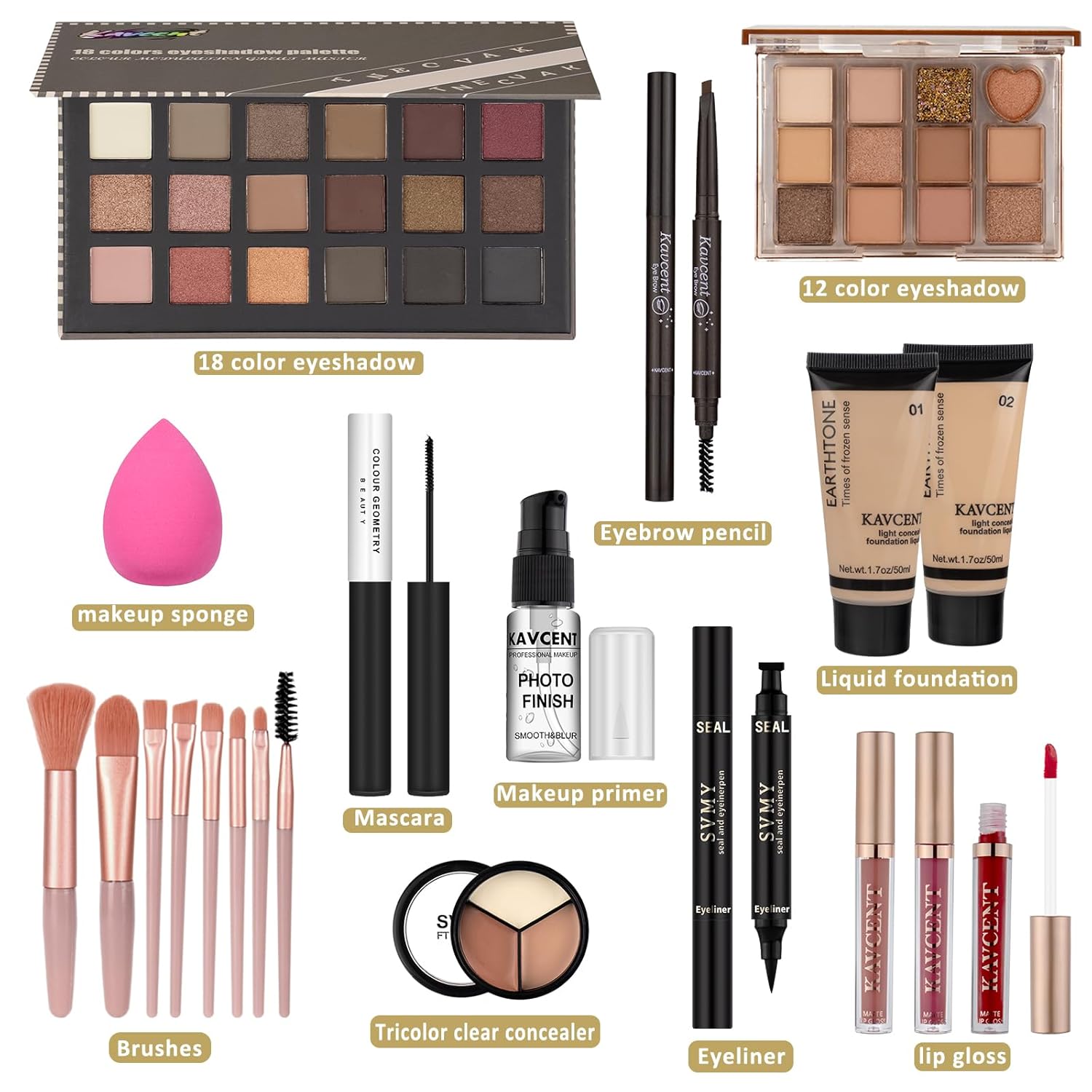 - 【All In One Makeup Kit】KAVCENT makeup set for teens contains: 18 color eyeshadow palette, lip gloss, liquid foundation, concealer, mascara, brow pencil, eyeliner, powder puff, makeup brushes set