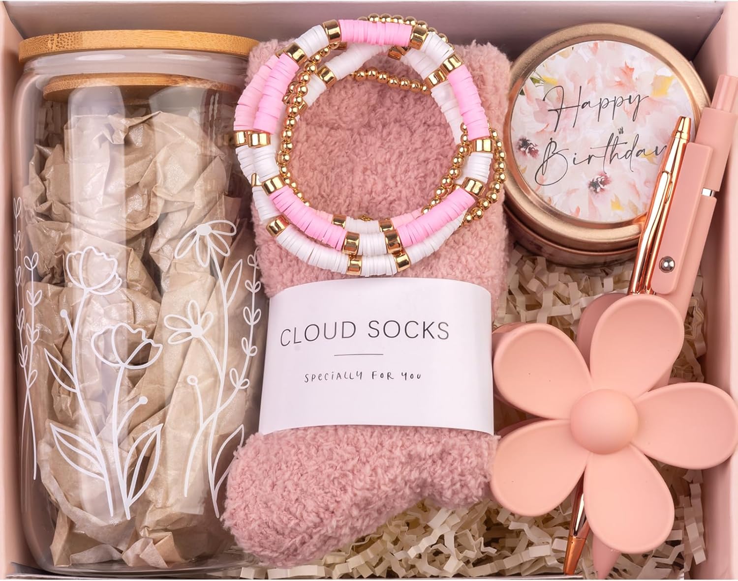- ๐AN UNFORGETTABLE UNBOXING๏ผThis birthday gift baskets for women contains 8 gifts beautifully packaged, one 16 oz floral coffee glass cup, One "Happy Birthday"Soy Wax Candle, two ballpoint pens, a set of clay beaded bracelets, one Soft Fuzzy Socks and a flower hairpin, one Greeting Card and Exquisite Happy Birthday Gift Box.