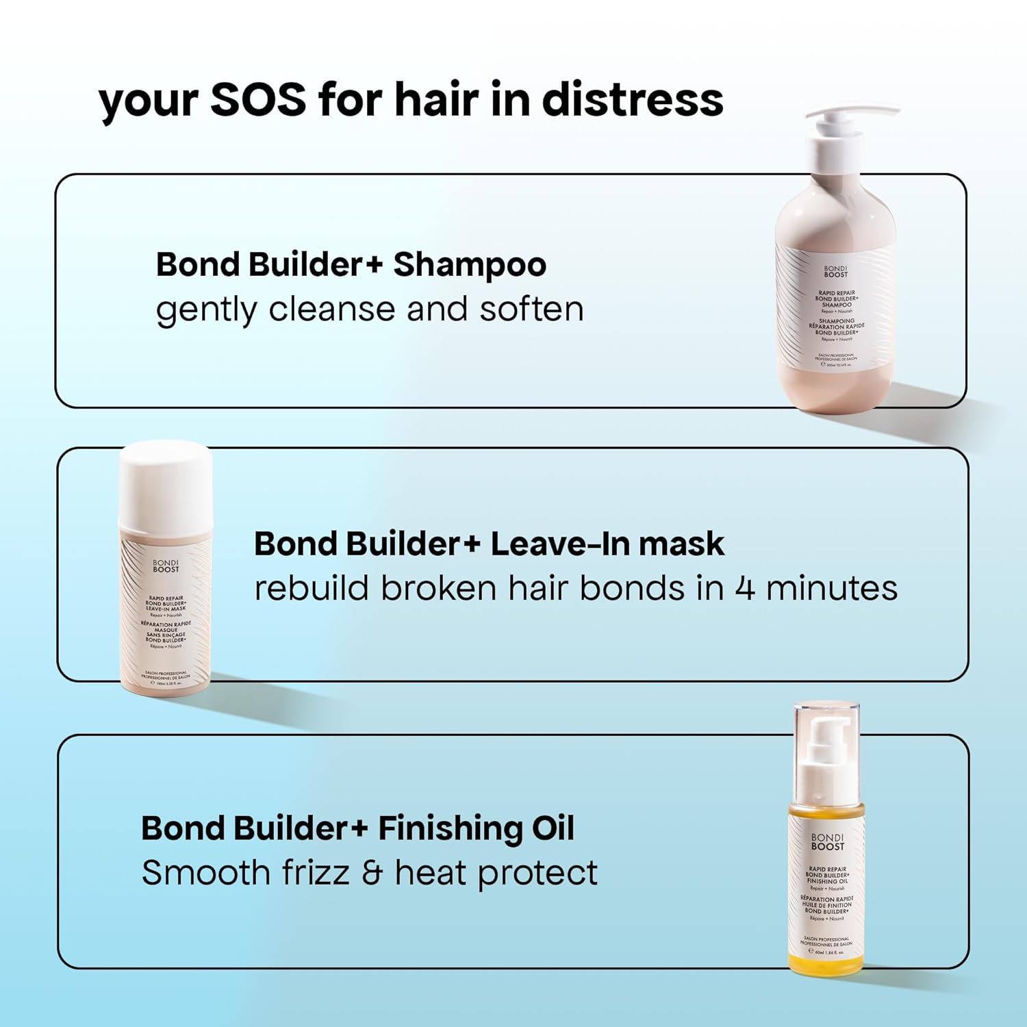 - HOW TO USE: Shake well before each use as natural ingredients may settle. Apply 1-3 pumps, emulsify in your hands, and massage into wet hair before rinsing. For a deeper cleanse, double cleanse to nourish both scalp and strands. BondiBoost recommends 1 pump for fine or short hair and up to 3 pumps for long or thick hair. Use as needed. For low damage from environmental stressors, follow with Bond Builder+ Conditioner and use the Bond Builder+ Hair Mask weekly.