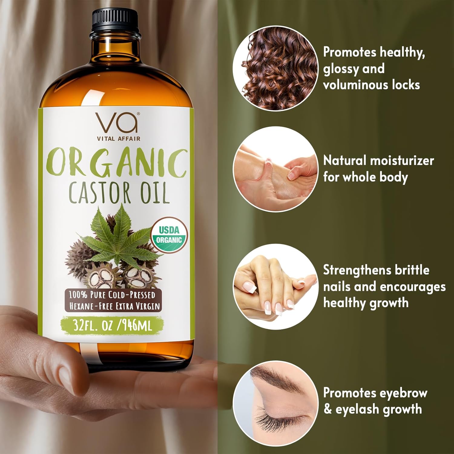 Pure Organic Castor Oil 32oz – Cold Pressed, Unrefined, USDA Organic – Glass Bottle for Hair Growth, Eyelashes, Eyebrows, Face & Castor Oil Packs