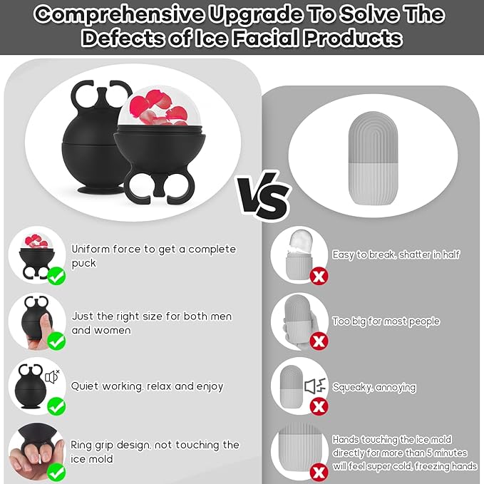 - USE UPGRADE: Compared to other ice face roller they problem point is that the size is big to use the feeling is not good, after turning into ice is difficult to open, open also often segmented into 2 halves can not be used, difficult to clean and so on.Our new ice facial sphere effectively solve these problems, the size of the right size,spherical curved surface so that it is easy to open,there will be no section into 2 sections of the situation,cleaning is also very easy and convenient