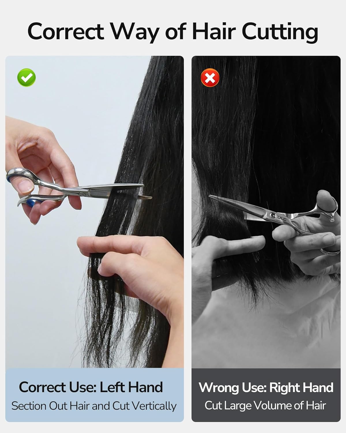 - Left-Handed Scissors: These professional left-hand scissors for hair cutting are razor sharp and safe to use on men, women, the elderly, children, and babies. 6.5-inch overall length, good for beginners and experts alike.