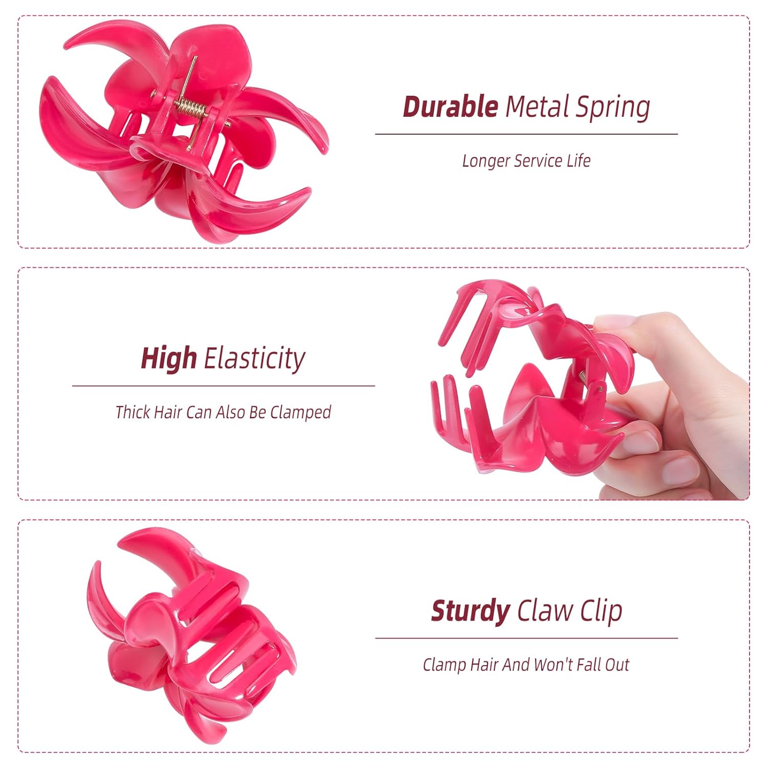 - Each flower claw clips is about 3.4x3.3 inch, the claw clip is crafted from durable plastic and metal spring, featuring an interlocking teeth design to ensure a secure hold without easily slipping off