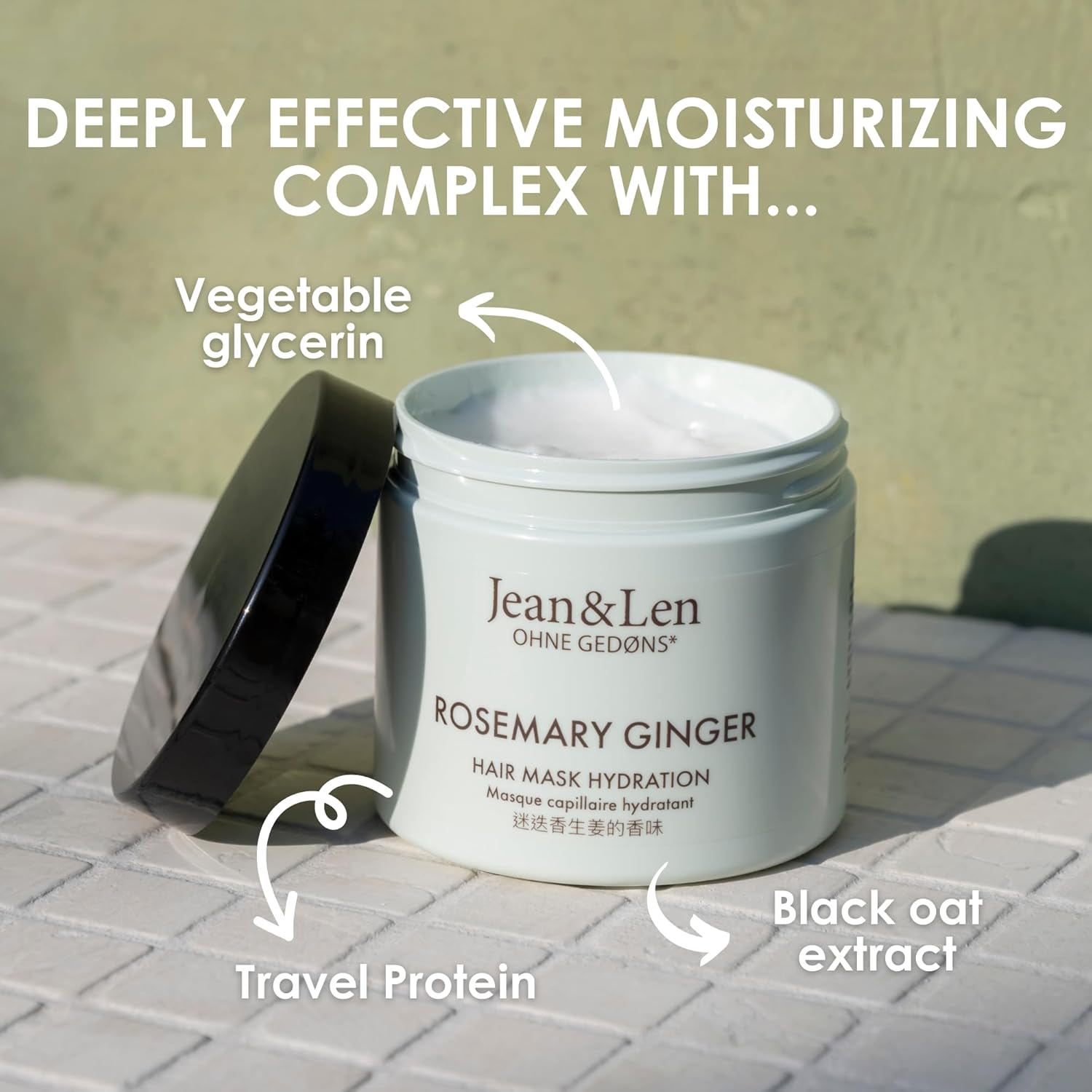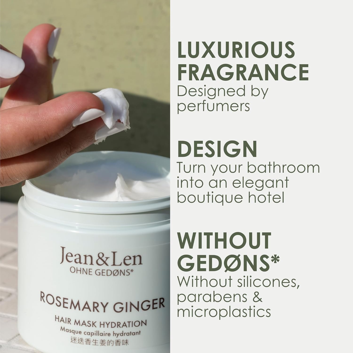 - Scope of supply: 1 x 6.76 Fl. Oz. Jean&Len Hair Mask Rosemary & Ginger, for very damaged, dry & dull hair, without parabens, silicones and microplastics