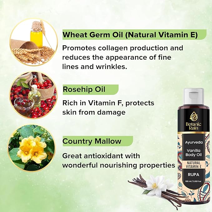 - Natural and Organic Ingredients: Our ayurveda body oil is made with natural and organic ingredients, which means it's gentle on your skin and free from harsh chemicals and synthetic fragrances. Vanilla oil is suitable for use on all skin types, including sensitive skin. Ayurveda products are designed to nourish and hydrate your skin, leaving it feeling silky-smooth and radiant.