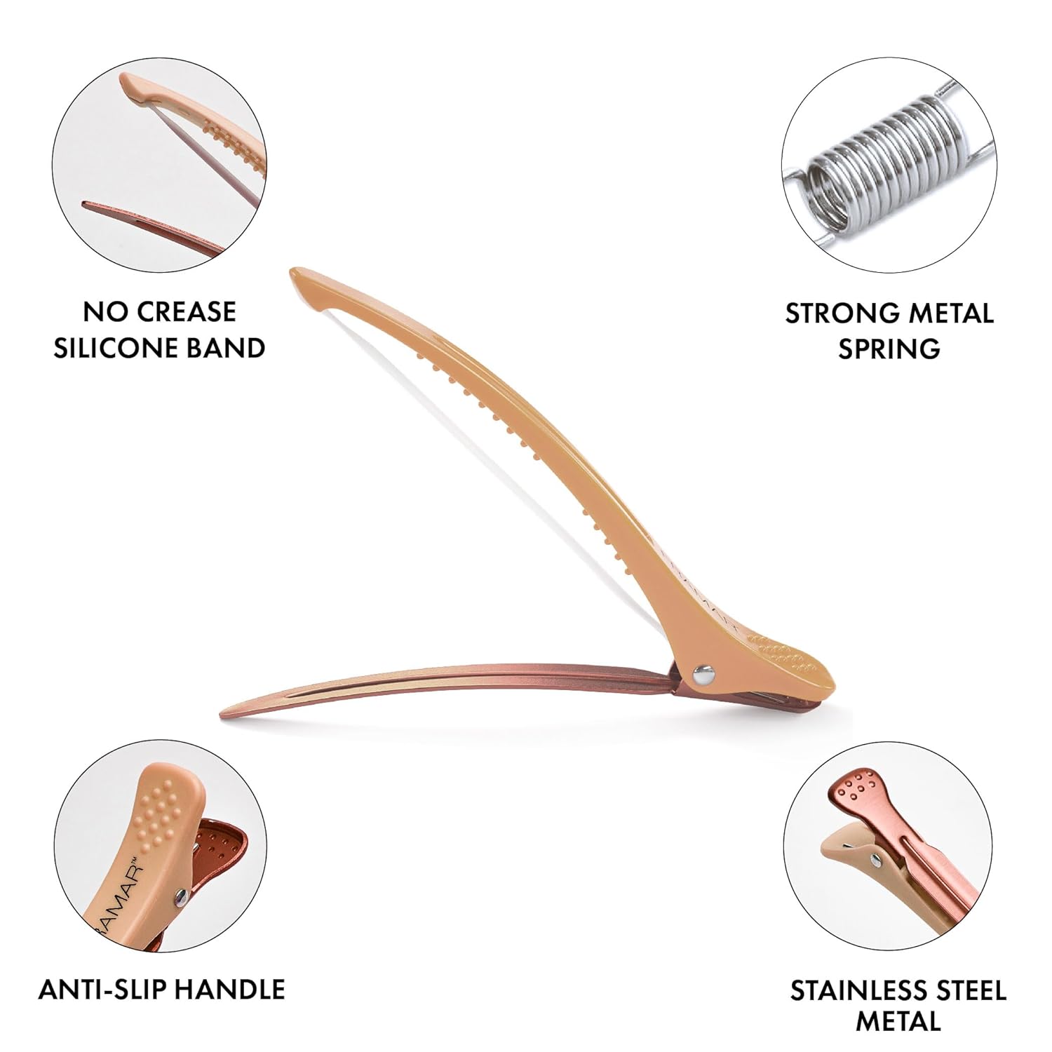- No Crease – Self locking salon clips with silicone strip to keep hair in place without creasing or denting any hair type. No more marks in your hair!