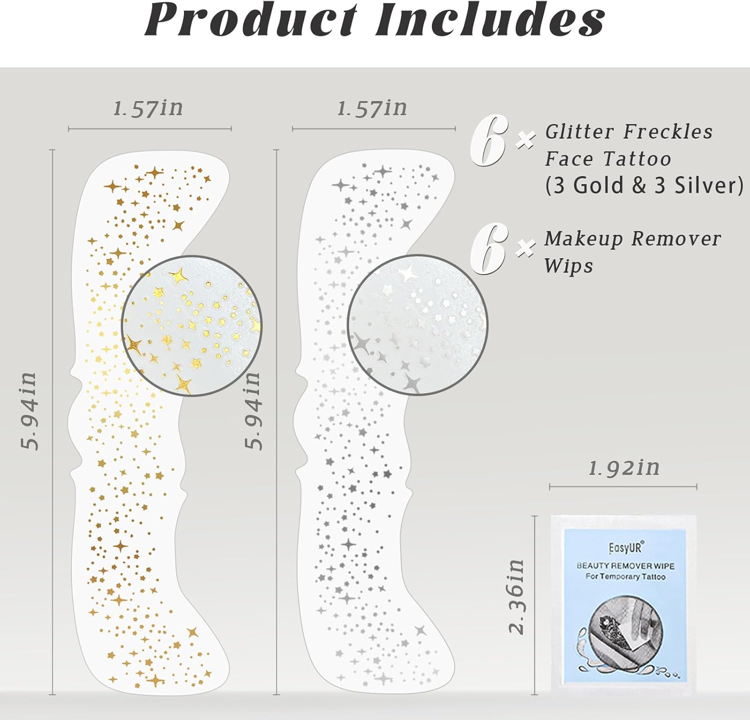 - Package Content: Set includes 3 pcs gold glitter freckle stickers, 3 pcs silver freckle stickers and 6 tattoo sticker remover wipes. They are made with safe ingredients, so you don't have to worry about bothering your skin