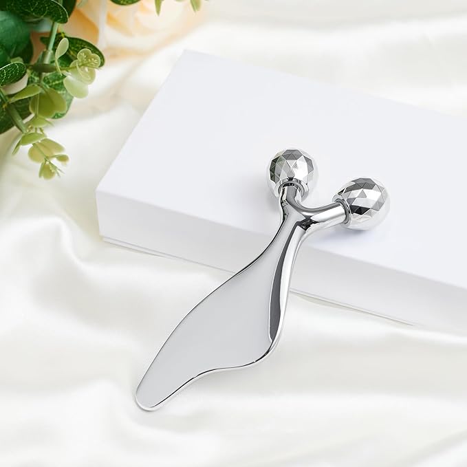 - 2-in-1 Facial Massager & Gua Sha Tool: This versatile face massager combines a 360° rotatable 3D roller and a smooth Gua Sha tool for a complete skincare routine. The Y-shaped design ensures close contact with your skin, promoting elasticity and a youthful glow.