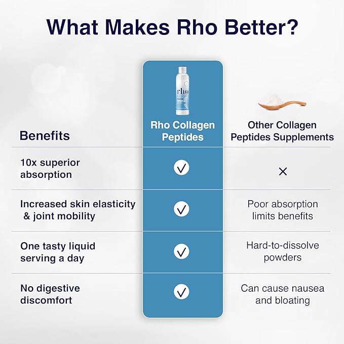 - 10X BETTER ABSORPTION: Liposomal technology encapsulates Rho Collagen into tiny pouches similar to cell membranes, increasing bioavailability and absorption by up to 10X. Rho bypasses the digestive system, ensuring superior absorption over traditional capsule, pill, and powder supplements prone to minimal absorption and potential side effects.