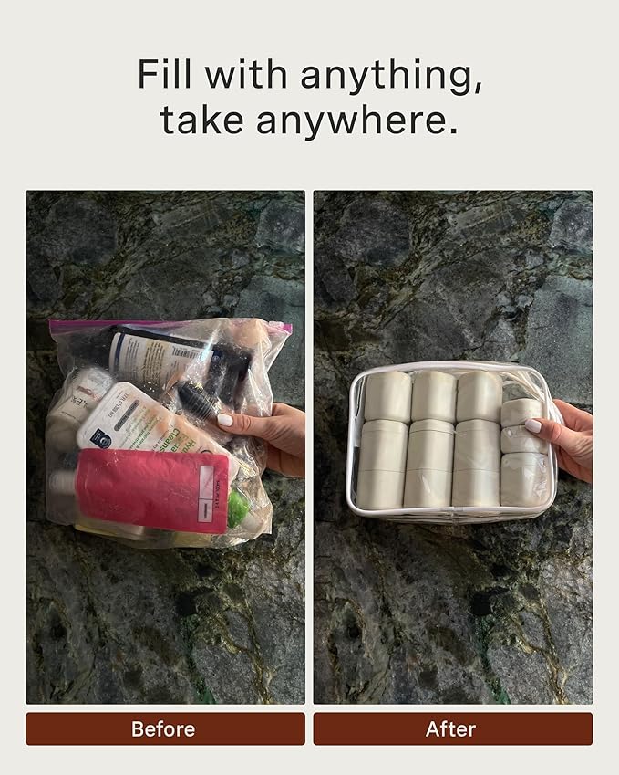 - TSA-COMPLIANT & 100% LEAKPROOF: Rest easy while traveling with our modular travel capsules. They are not only TSA-compliant but also 100% leakproof, ensuring your liquids and essentials stay securely contained. Pack these carry on reusable containers and say goodbye to messy spills on your journeys!