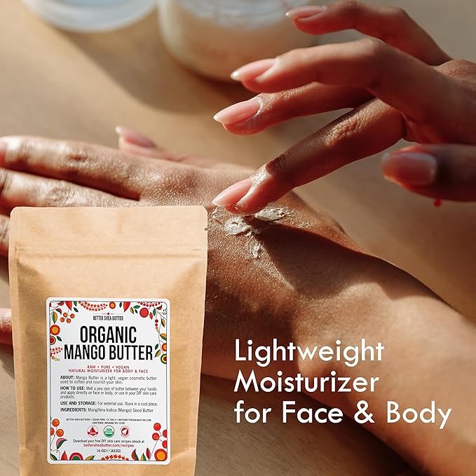 - Organic Mango Butter : Experience the purity of mango butter raw organic unrefined, a versatile ingredient for soap making supplies, a lotion making kit or body butter making supplies. This certified organic raw butter is cold pressed to retain all its natural benefits, making it perfect for a homemade lotion bar, natural body lotion, hair butter and belly butter.