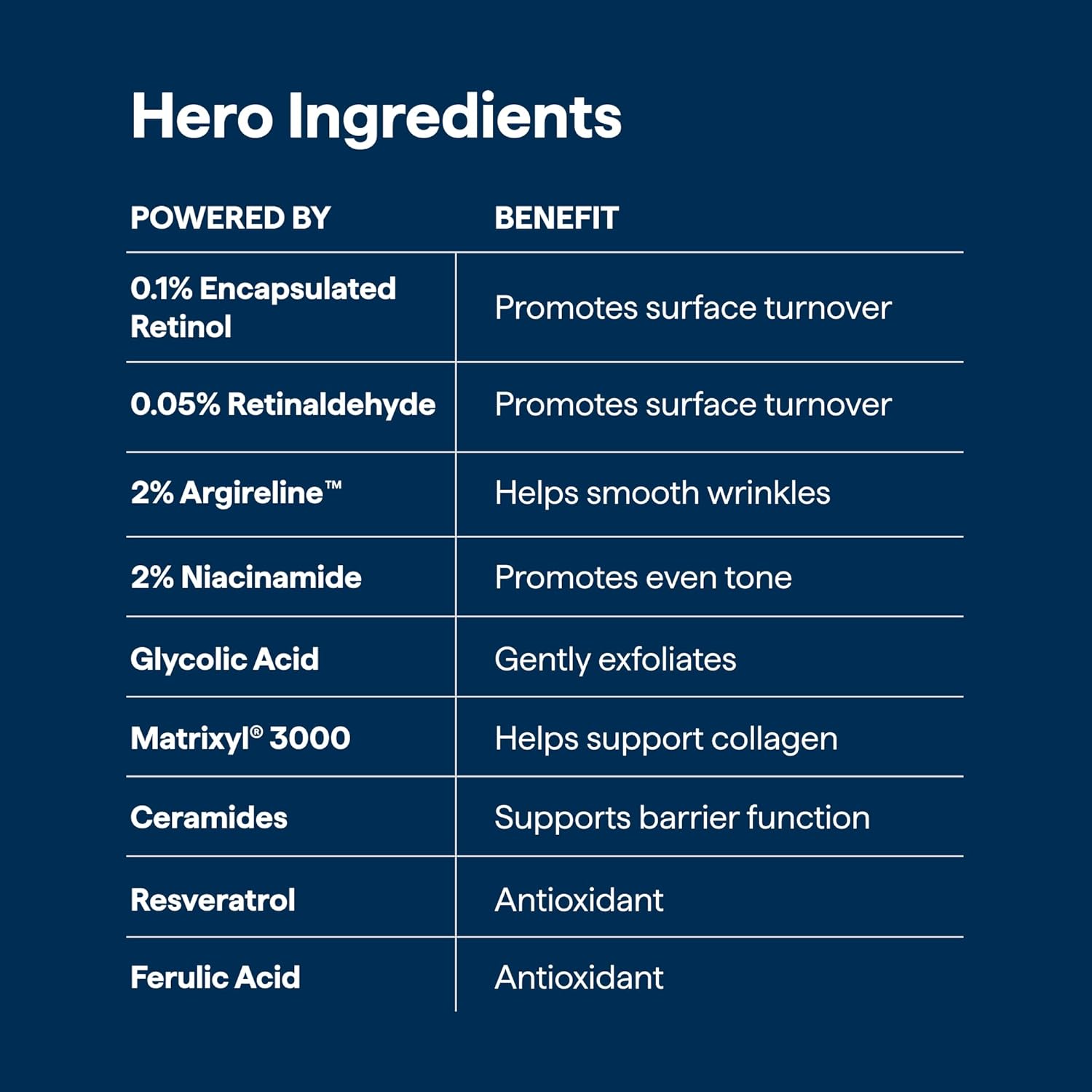 - [9 Powerful and Proven Actives] Features 0.1% Encapsulated Retinol, .05% Retinaldehyde, 2% Argireline, Glycolic Acid, 2% Niacinamide, Matrixyl 3000, Ceramides, Resveratrol, Ferulic Acid.
