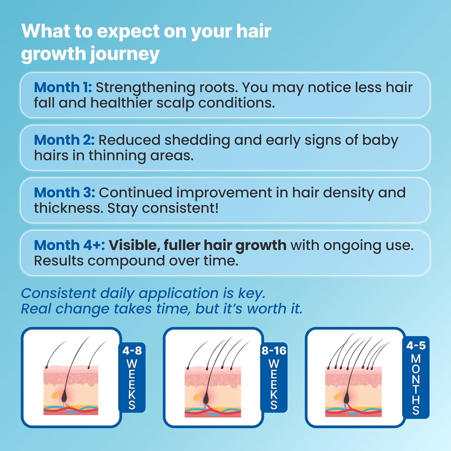 - 5% Minoxidil Formula - Our 5% minoxidil for men and women contains the highest concentration of Minoxidil, promoting effective hair regrowth. With consistent use, visible improvements can be seen in just 3-4 months, offering a reliable solution for thinning hair.