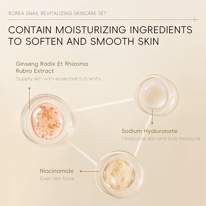 - 【Skin Care Set】——The Korean Snail Skincare suit contains a lot of snail secretion filtrate to help skin elasticity for a youthful and vibrant complexion. Our Beauty Gift Set can penetrate deep into the bottom layer of the skin, continuously replenish moisture to the skin, to achieve long-lasting moisturizing skin care effects,making the skin moist and soft