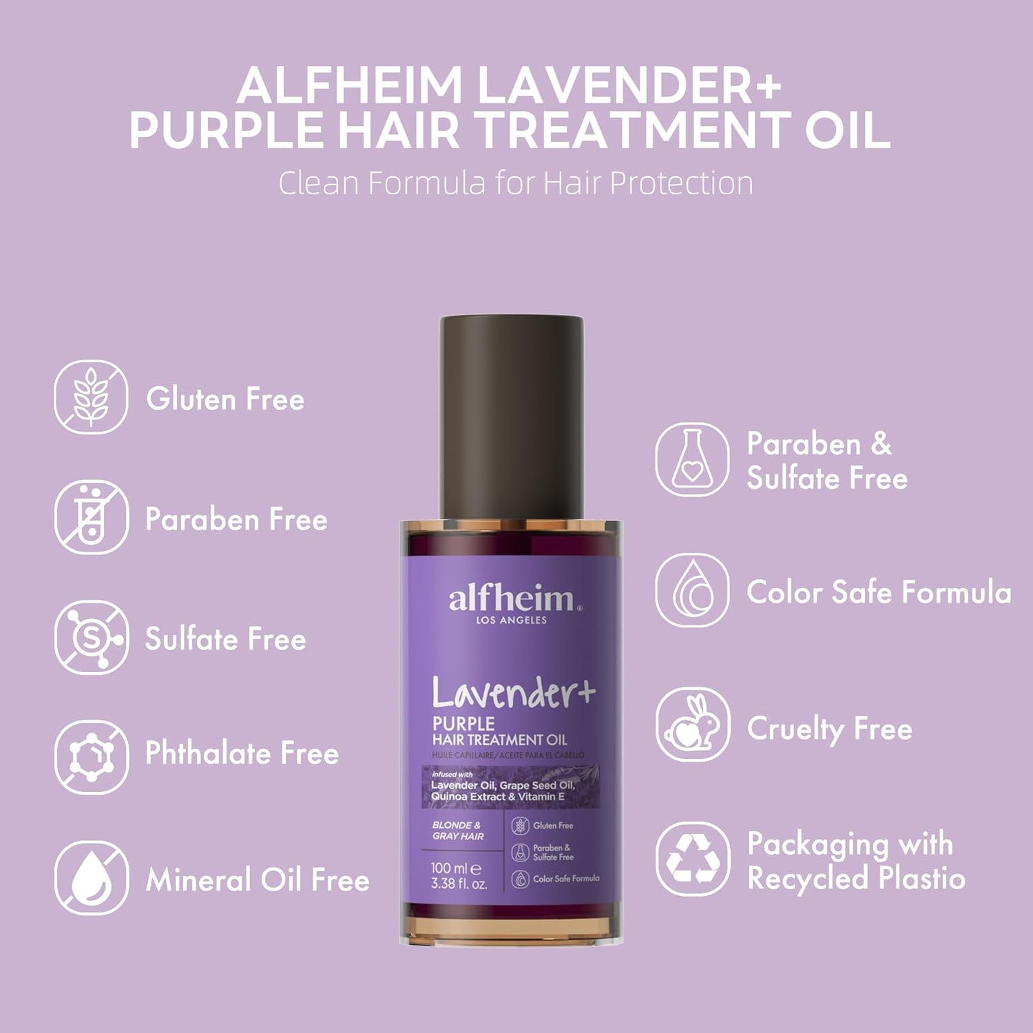 ALFHEIM Lavender+ Purple Hair Oil for Blonde, Silver & Color-Treated Hair – Anti-Brass & Frizz Control Serum – Restores Shine, Smoothness & Cool Radiance – with Grape Seed Oil – 3.38 oz / 100 ml