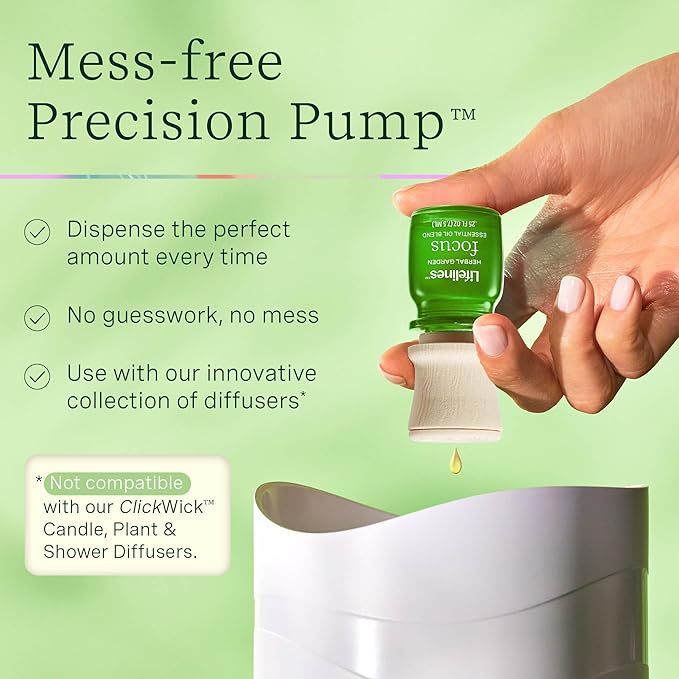 - Mess-Free Precision Pump: Dispense the perfect amount every time with no guesswork and no mess. NOT compatible with our ClickWick Candle, Plant, or Shower diffusers, which require ClickWick Essential Oil Blends.