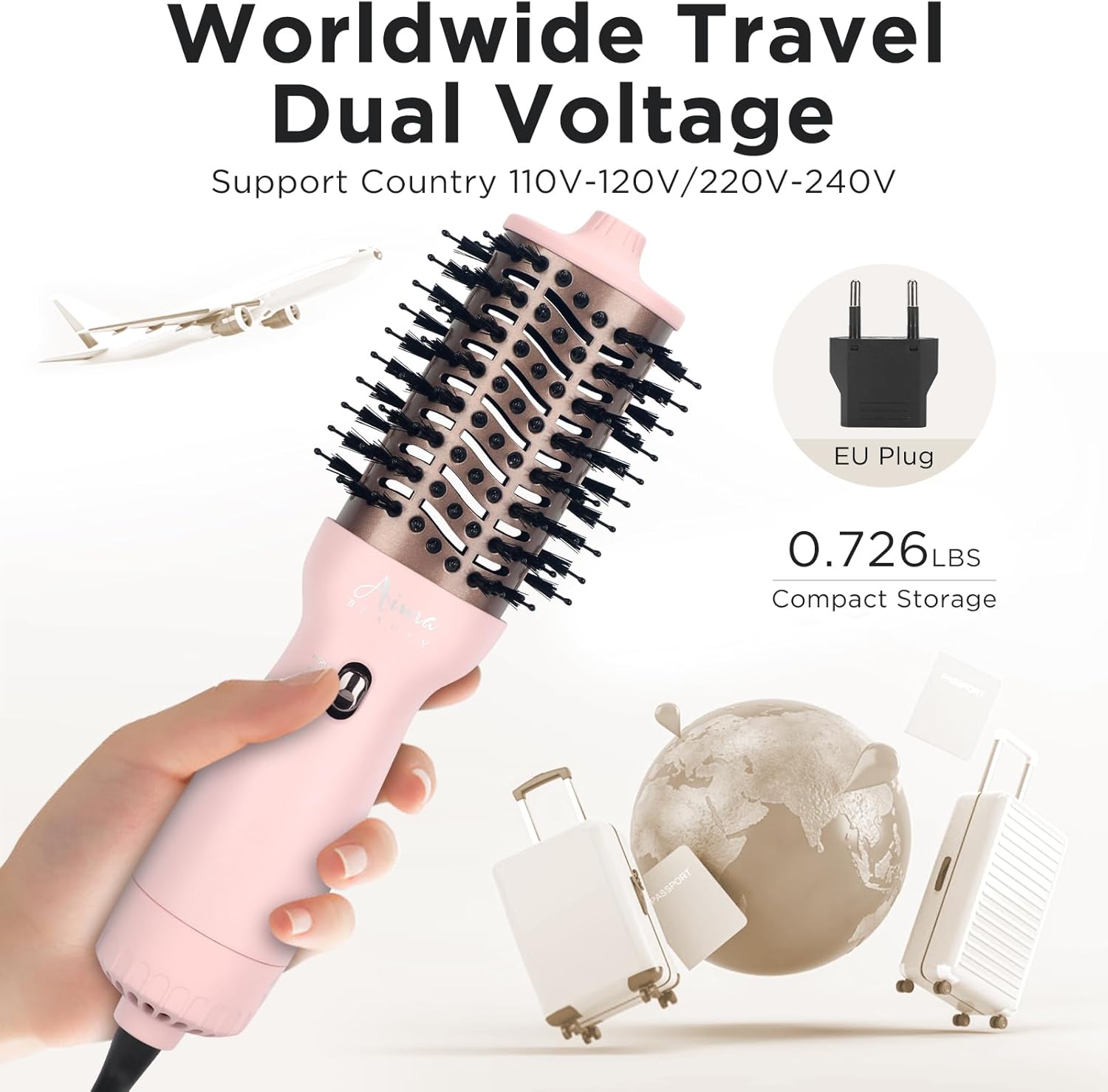 Aima Beauty Worldwide Travel Hair Dryer Brush 110V-240V Dual Voltage Blow Dryer Brush Hot Air Brush with Oval Barrel 360° Hot Airflow, Negative Ionic Frizz-Free Drying/Straightening/Voluming, Pink