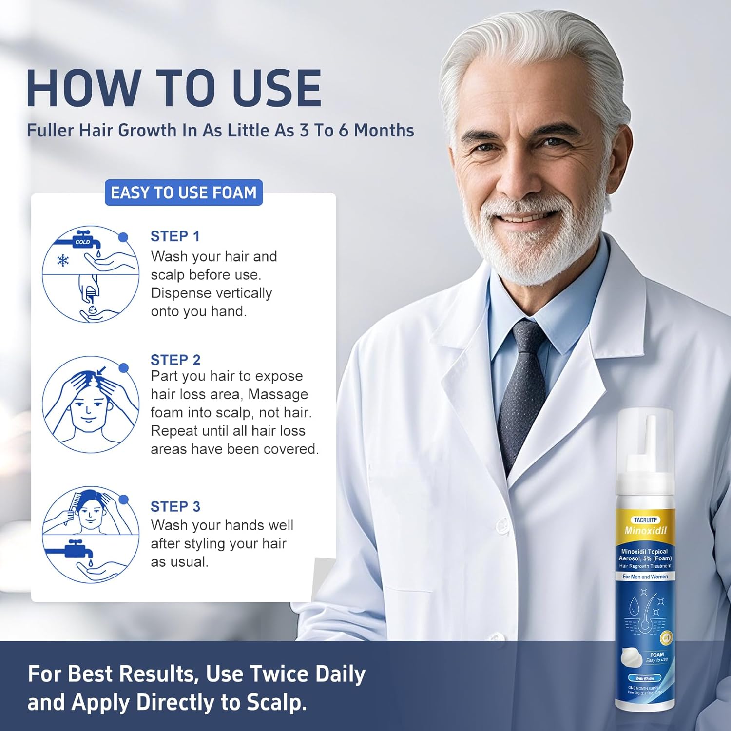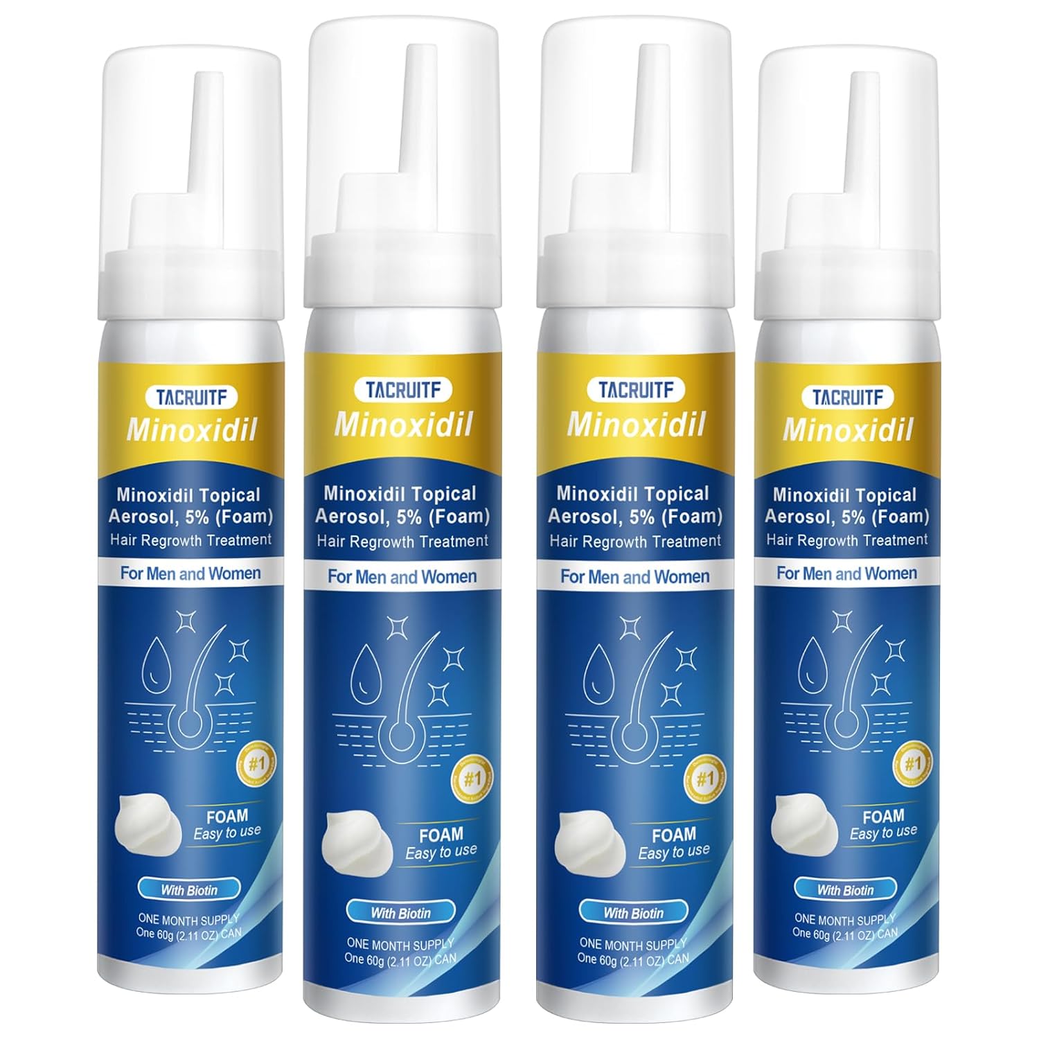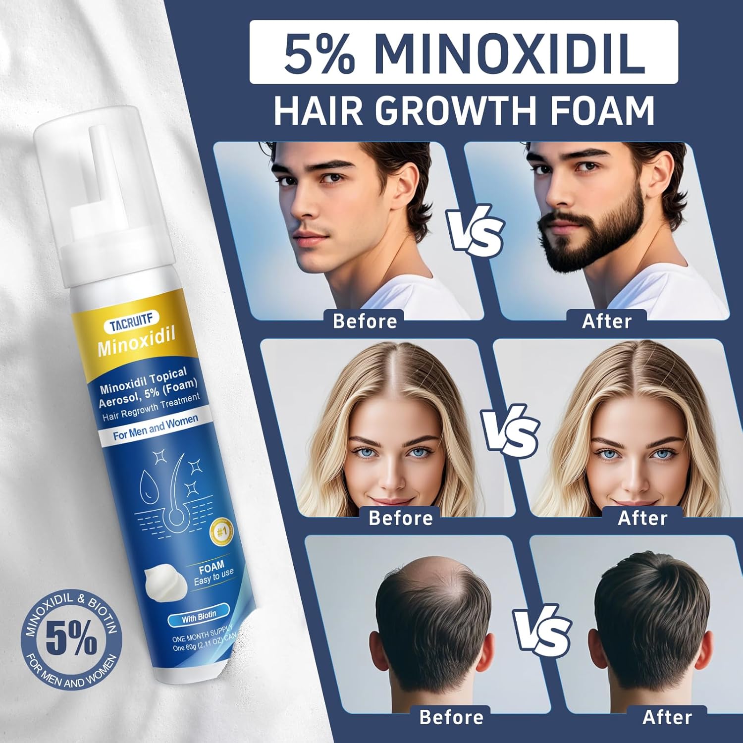 - TACRUITF 5% TOPICAL MINOXIDIL FOAM: We built Tacruitf to give men and women across the country an affordable, expert-backed plan to make your hair to looks its best! Try Our 5% Minoxidil Foam Hair and Beard Growth Products. Shop now for thick and full hair!