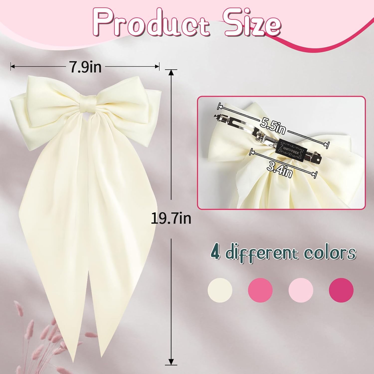 Silky Satin Hair Bows for Women Girls - 4PCS Ribbon Bows for Hair, Big Bow Hair Clips with Long Tail, Barrettes - Cute Hair Accessories Gifts (Hot Pink, Light Pink, Royal Pink, Beige)