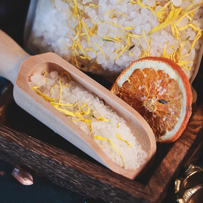 - Wooden spoon (4” long) makes it easy to scoop the desired amount of salt, and a reusable muslin bag allows for mess-free use. Simply fill the bag, drop it in warm water, and enjoy a relaxing bath with minimal cleanup.